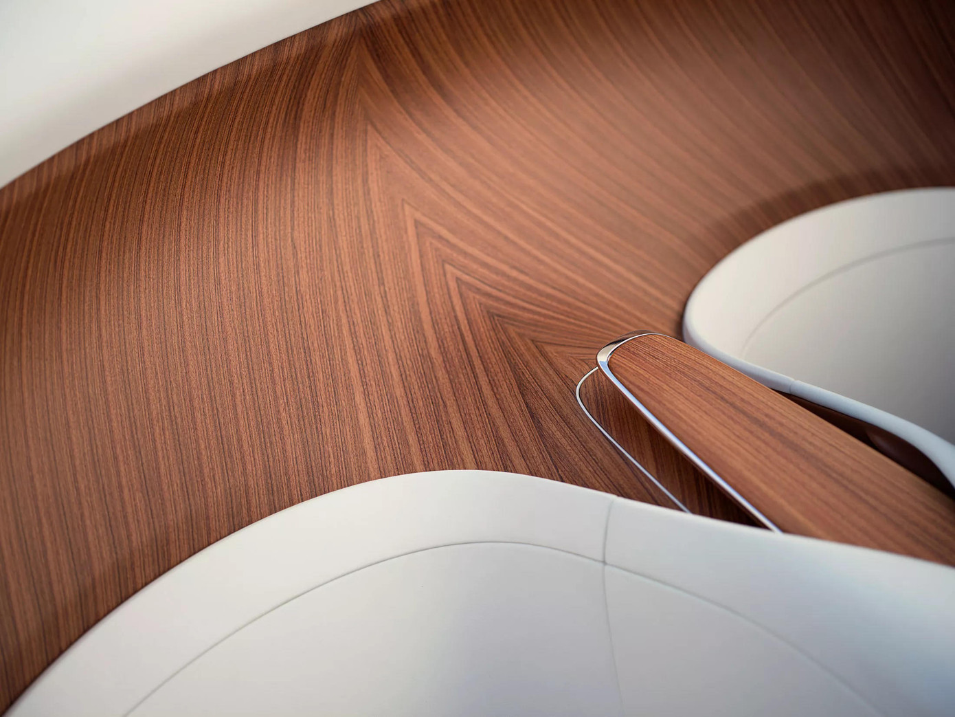 Màu chủ đạo của nội thất trên Arcadia Droptail là trắng kết hợp hài hòa với màu nâu bespoke cho phần ngoài của ghế ngồi và tựa đầu. Viền gỗ bao quanh khoang cabin, trải dài từ bảng táp-lô, ốp cửa đến phần cong sau ghế.