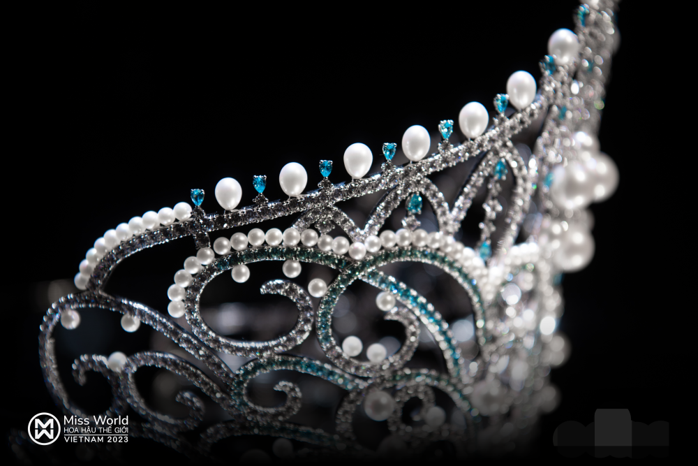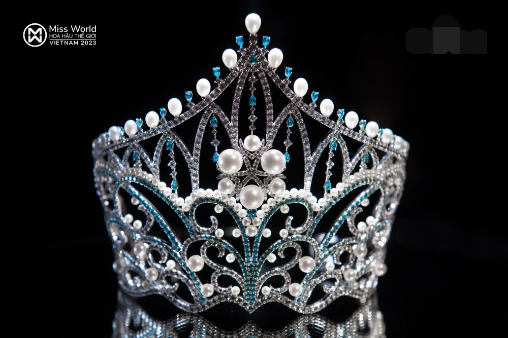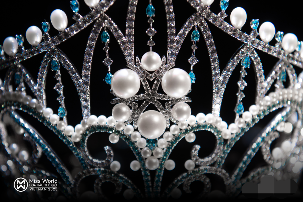 Vương miện Miss World Vietnam 2023 được đính kết 999 viên đá quý trắng và 299 viên đá quý xanh, 168 viên ngọc trai biểu trưng cho vẻ đẹp trường tồn, mãi mãi song hành.