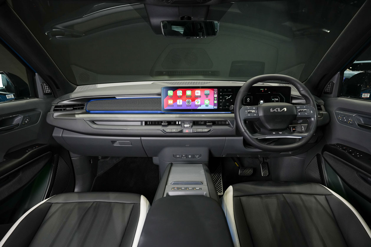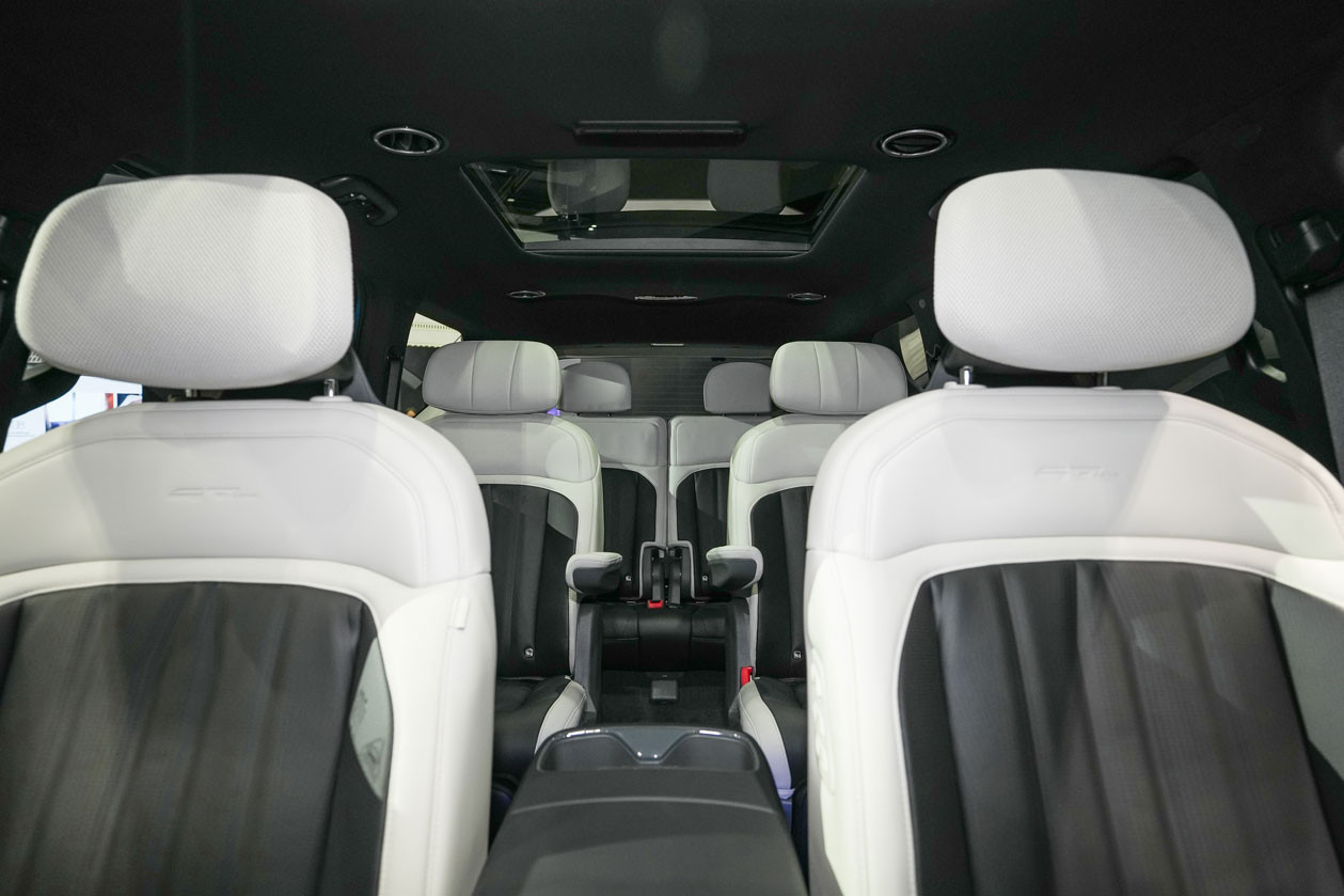 Kia EV9 có 6 chỗ ngồi, trong đó hàng ghế thứ 2 của xe có thể xoay 180 độ. Nội thất của mẫu EV9 khá hiện đại với một màn hình 12,3 inch cho cụm đồng hồ và một màn hình thông tin giải trí với kích thước tương tự. Chưa dừng lại ở đó, Kia EV9 được bổ sung thêm một màn hình nhỏ kích thước 5,3 inch cho hệ thống điều hòa.