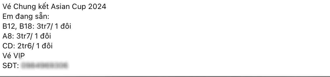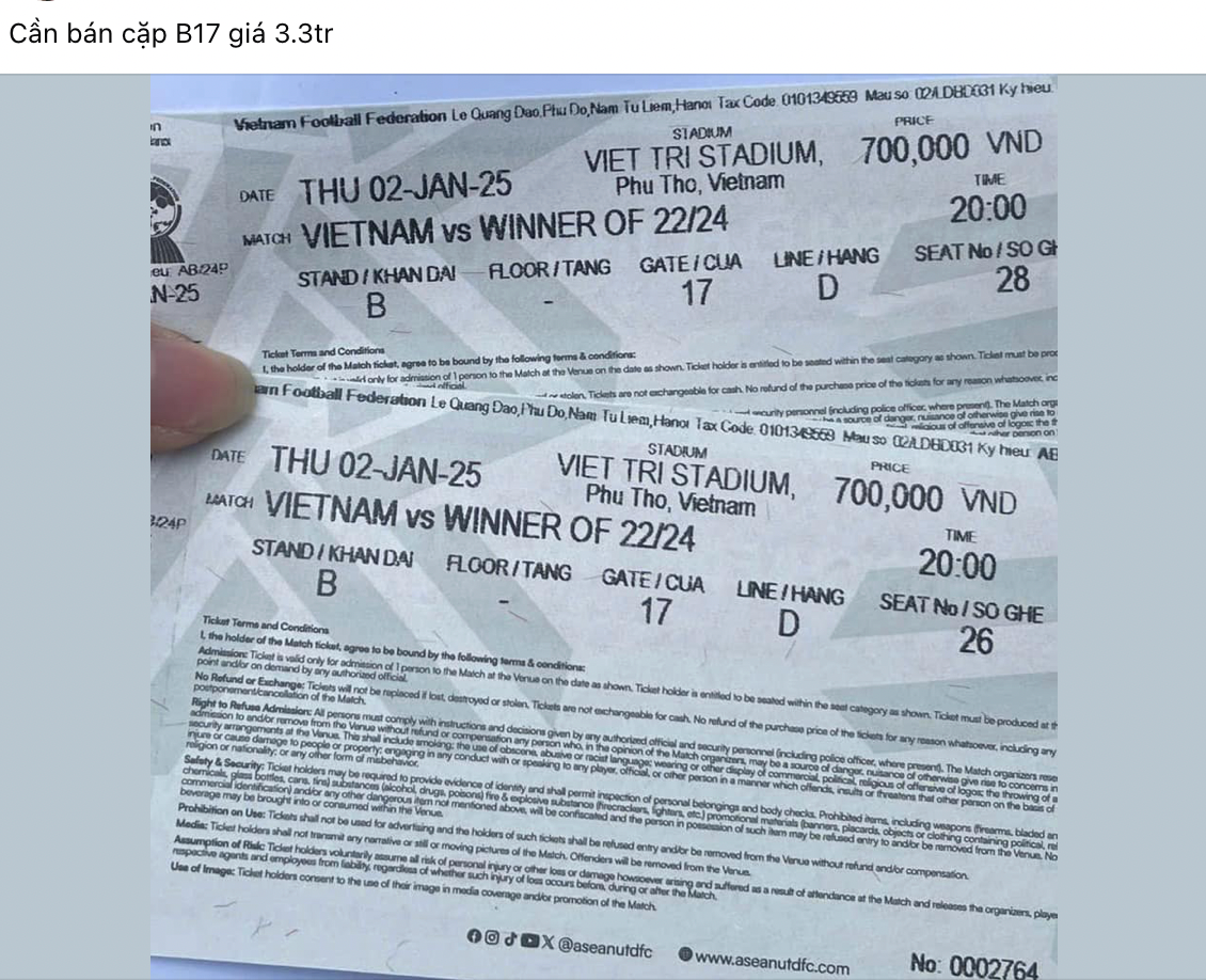 Cụ thể, có bài đăng rao bán cặp vé khu A3 với giá hơn 6 triệu đồng/cặp, trong khi giá gốc là 2 triệu đồng/cặp. Những cặp vé có giá gốc 1,4 triệu đồng/cặp lại được mời chào khoảng 3-5 triệu đồng/cặp. Còn lại khán đài C và D với mệnh giá gốc 1 triệu đồng/cặp được phe vé hét giá từ 3-4 triệu đồng/cặp.