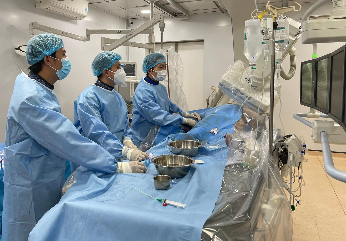 Qua chẩn đoán hình ảnh, bác sĩ xác định người bệnh bị nhồi máu cơ tim cấp, nguy cơ tử vong bất kỳ lúc nào. Sau hội chẩn nhanh liên chuyên khoa, các bác sĩ đã quyết định thực hiện thông tim can thiệp khẩn nhằm tái thông mạch vành cho người bệnh.