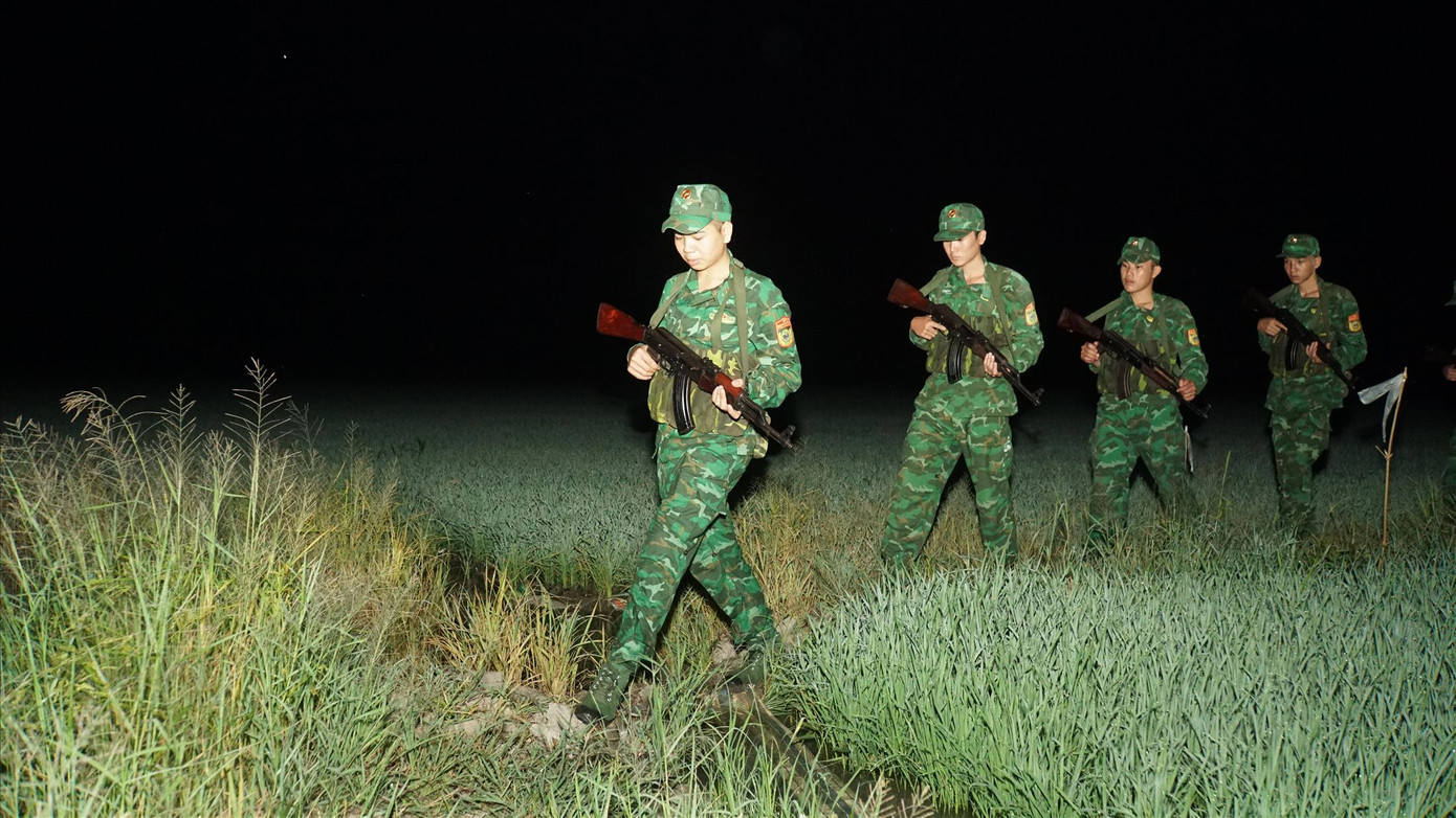 | Cán bộ, chiến sĩ Đồn Biên phòng Vĩnh Nguơn tuần tra biên giới trong đêm. Ảnh: Hòa Hội |