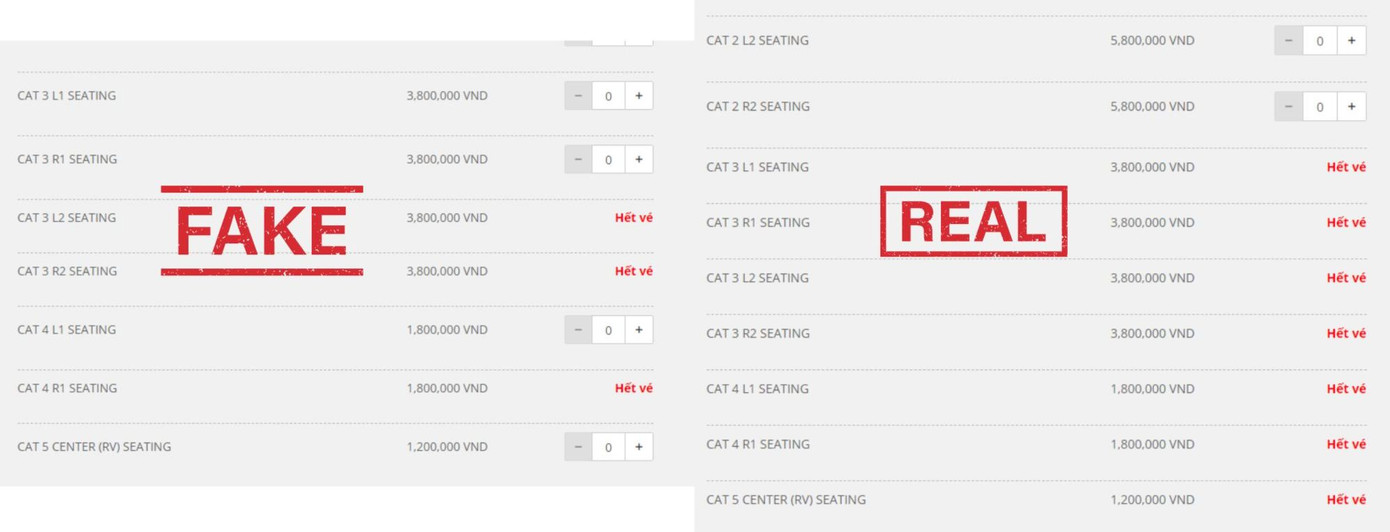 Thứ hai là lượng vé. Trên web giả, vé concert trong 2 đêm diễn ở các hạng vé vẫn còn, chỉ sold out (hết vé) ở 3 loại (CAT 3 L2, CAT 3 R2 và CAT 4 R1). Trong khi ở website thật, toàn bộ hạng vé từ CAT 3 đến CAT 5 đã bán hết chỉ sau khoảng 10 - 15 phút mở bán.