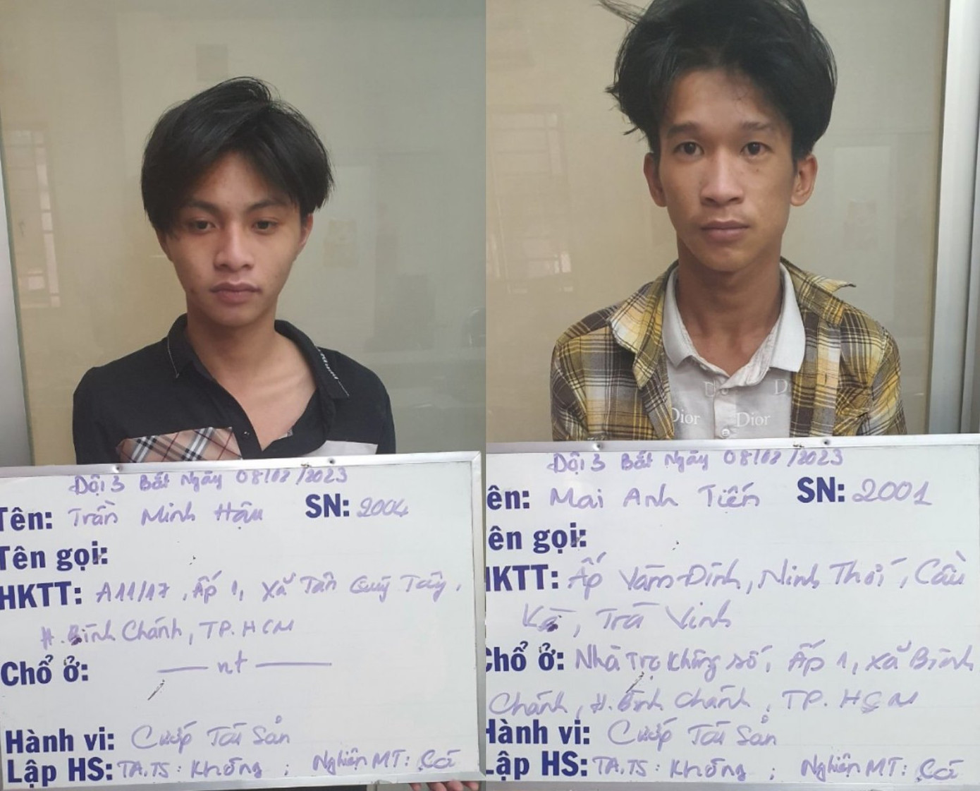 Các đối tượng bị bắt giữ để điều tra về hành vi “cướp tài sản” gồm: Trần Minh Hậu (19 tuổi), Mai Anh Tiến (22 tuổi,) và L.T.N.H (16 tuổi) cùng ngụ tại huyện Bình Chánh, TPHCM.