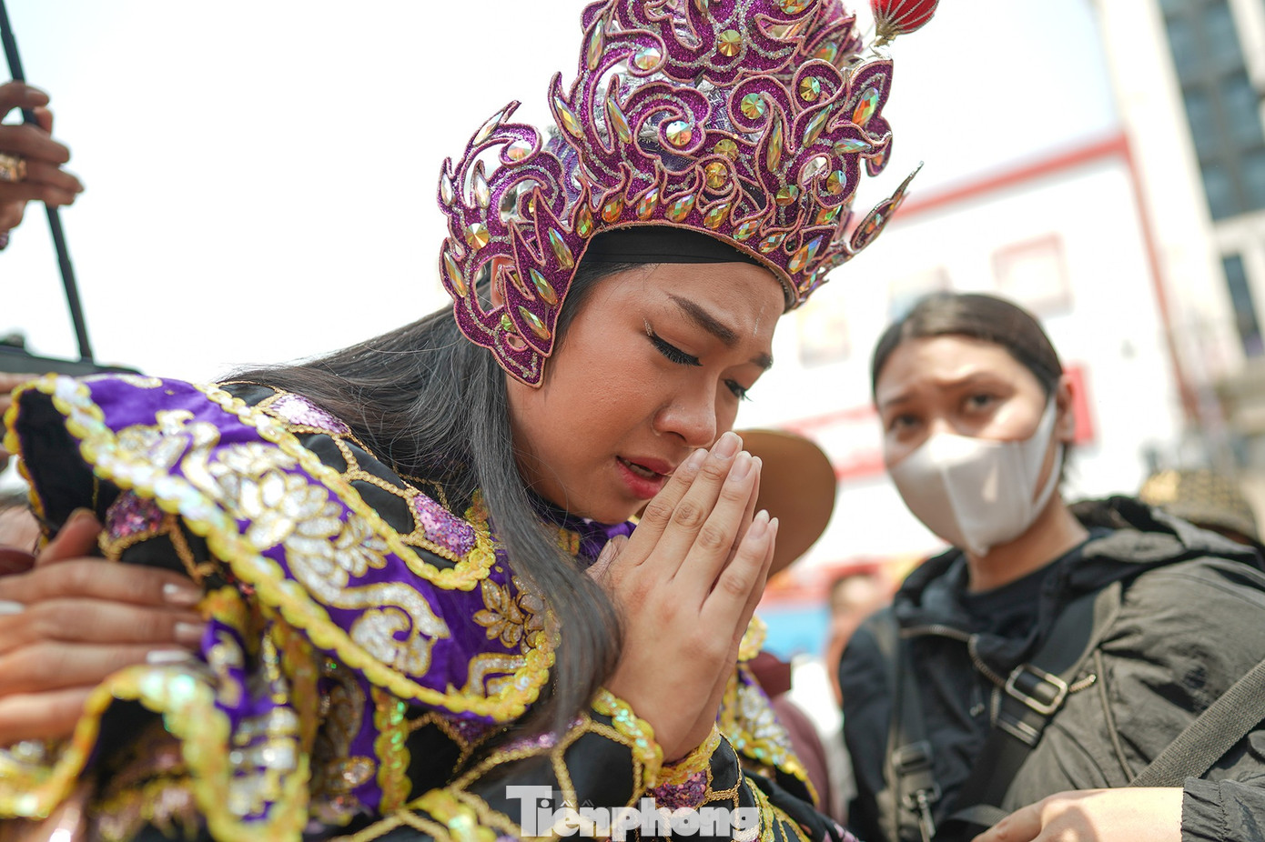 Dẫn đầu đoàn tang lễ là sư thầy đọc kinh cầu siêu. Đội hóa trang thành nhân vật tuồng cổ đi sau để tạo không khí trang nghiêm. Tiếng đọc kinh, tiếng chuông gõ vang cả một góc đường.