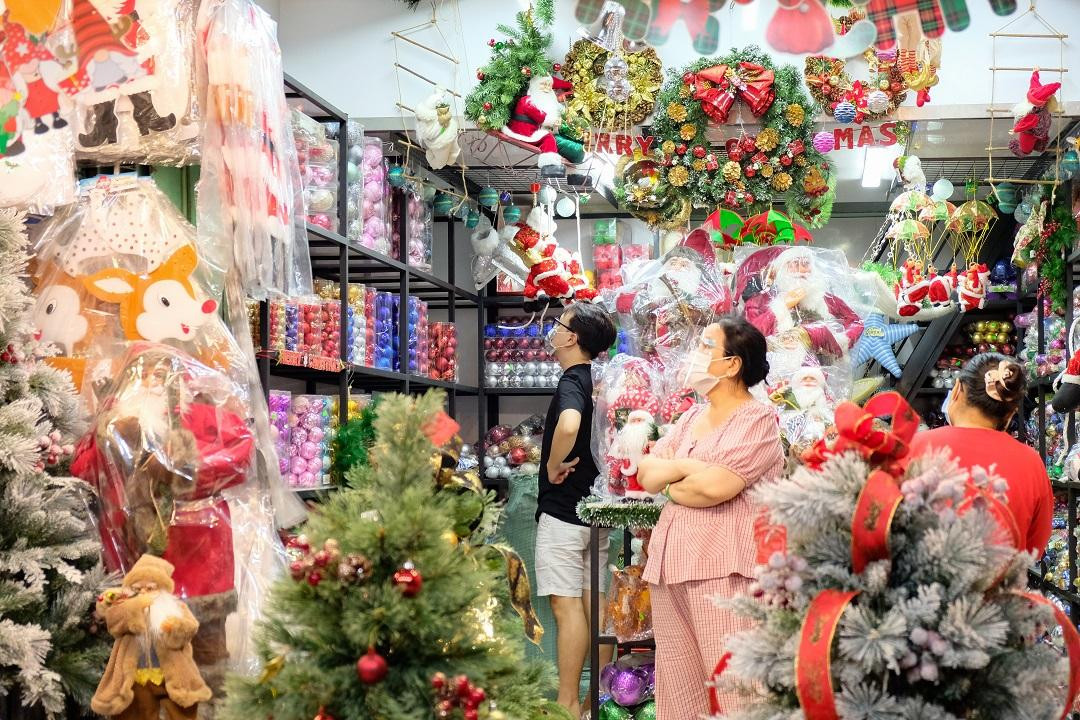 Theo ghi nhận của PV Tiền Phong, nhiều cửa hàng trên đường Hải Thượng Lãn Ông (quận 5, TP.HCM) đã bày bán đồ trang trí Giáng sinh từ đầu tháng 11 với nhiều mặt hàng bắt mắt, mẫu mã đẹp như cây thông nhựa, người tuyết, ông già Noel, các phụ kiện nơ, bông tuyết,…nhưng về sự nhộn nhịp thì theo chia sẻ của người bán thì không bằng mọi năm do ảnh hưởng của dịch bệnh.