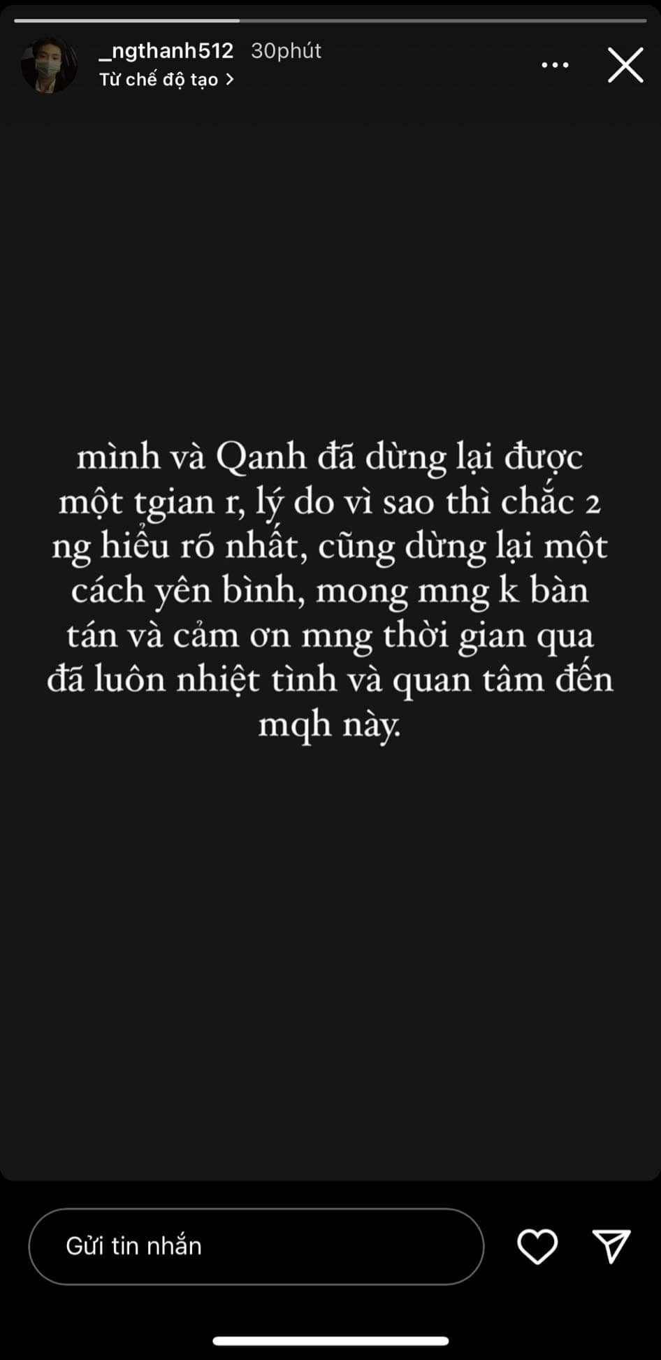 Nguyễn Thành chia sẻ trên Story Instagram cho biết anh và đối phương chia tay trong êm đẹp và không muốn gây ồn ào về chuyện tình cảm.