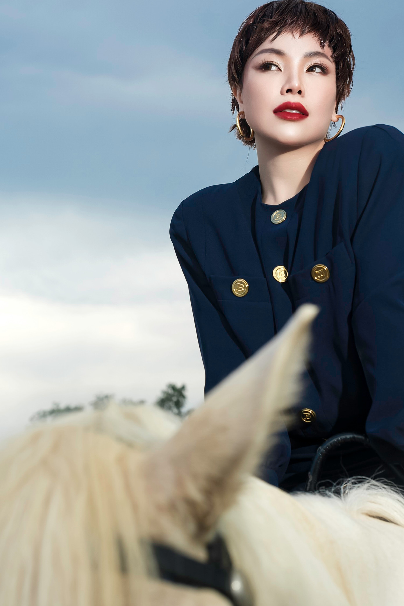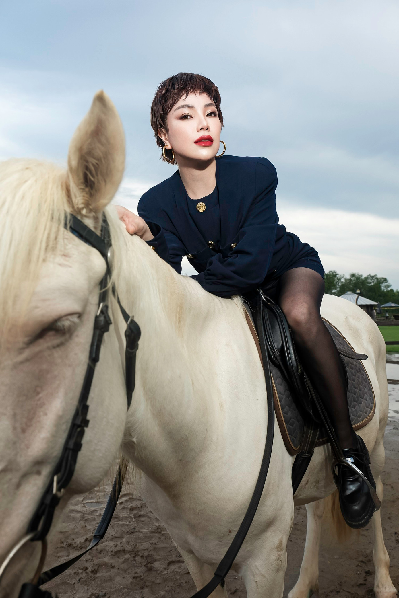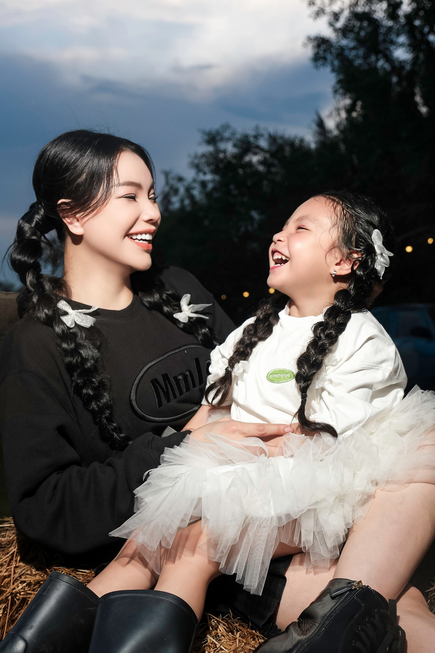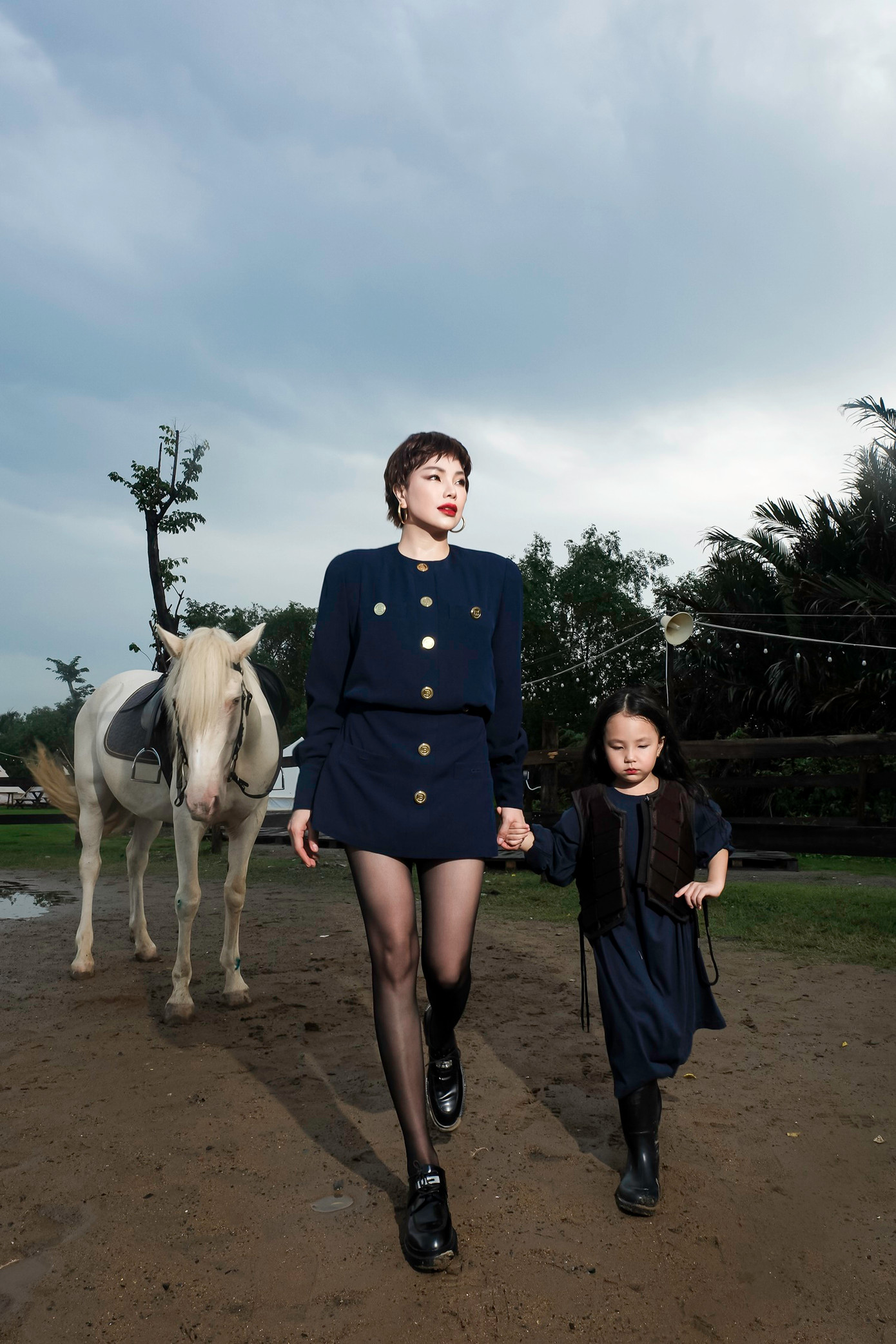 Ở set đồ đầu tiên, Trà Ngọc Hằng và con gái Sophia ton sur ton với trang phục đen cá tính. Cả hai cùng nhau tạo dáng với chú ngựa trắng to lớn.