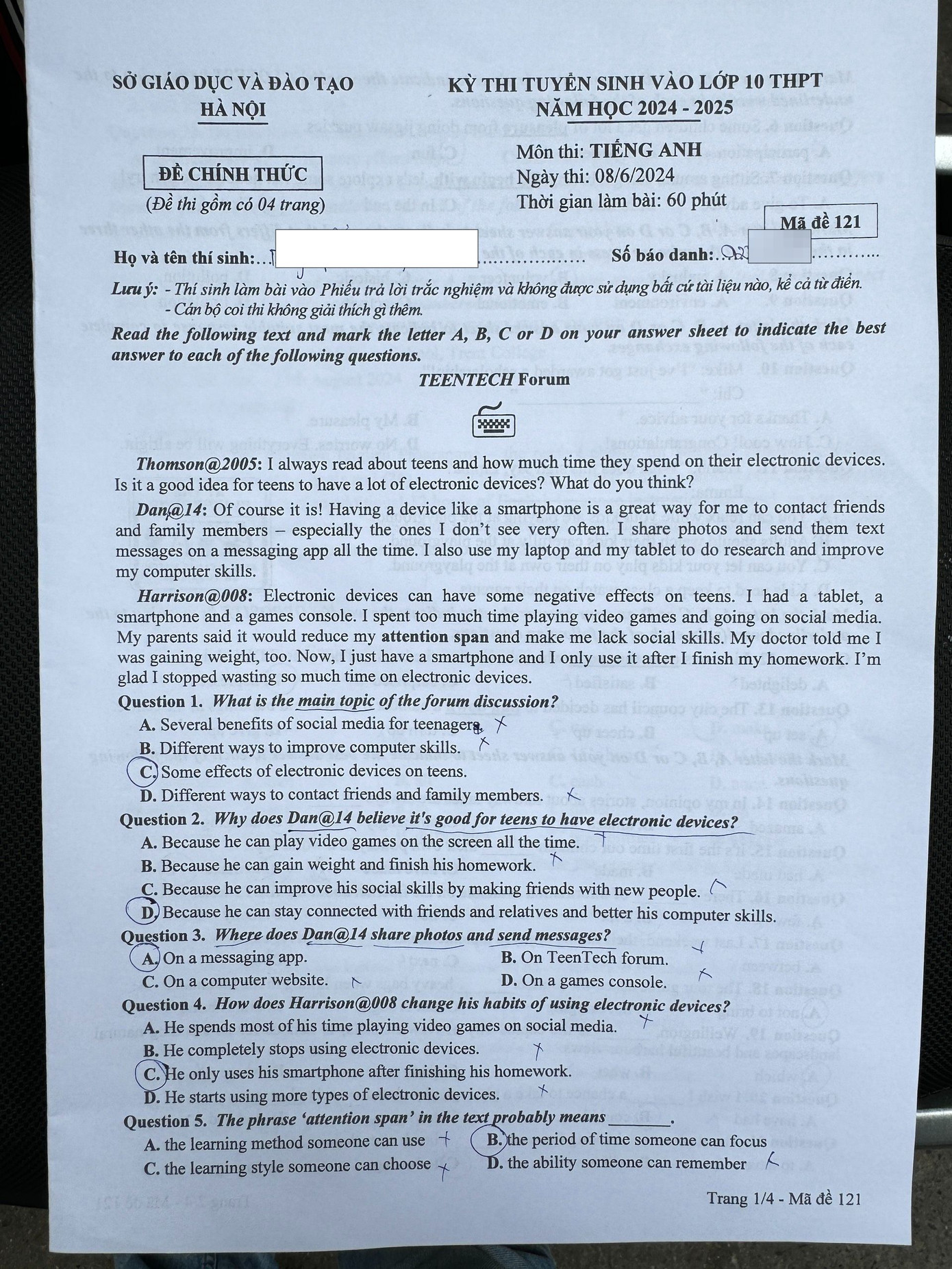 Đề thi môn tiếng Anh vào lớp 10 tại Hà Nội gồm 40 câu trắc nghiệm, được trộn thành 24 mã đề, thí sinh làm trong 60 phút.
