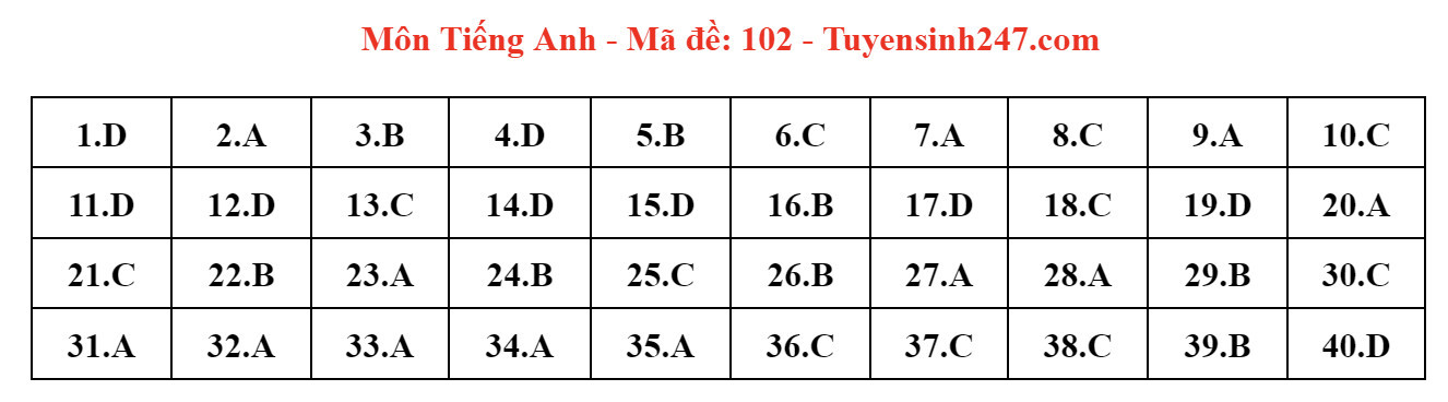 Đáp án mã đề 102: