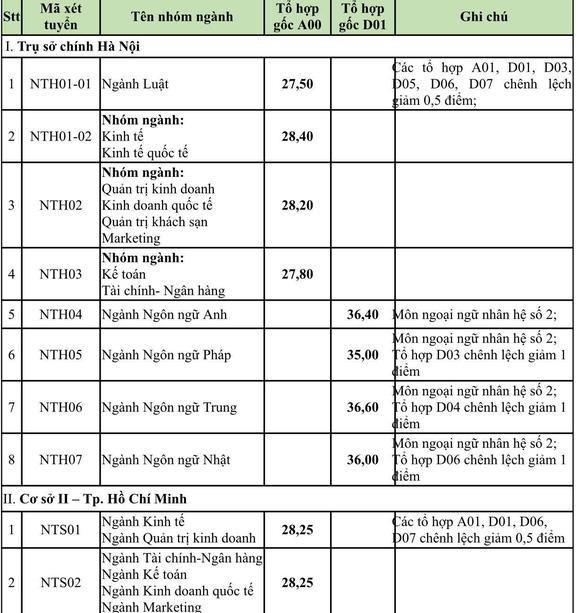 Trường đại học Ngoại thương công bố điểm chuẩn chính thức với mức cao nhất là 28,40, thấp nhất là 27,5.