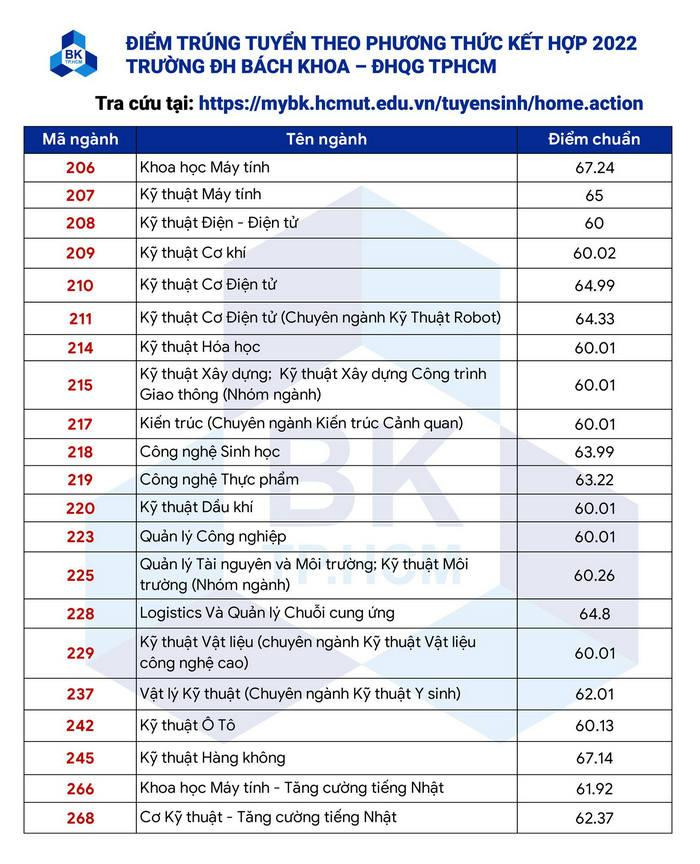 Trường Đại học Bách Khoa - ĐHQG TP.HCM đã chính thức công bố điểm trúng tuyển phương thức xét tuyển tổng hợp năm 2022. Điểm xét tuyển được tính bằng công thức: [Điểm ĐGNL quy đổi] x 70% + [Điểm TN THPT] x 20% + [Điểm học tập THPT] x 10%.