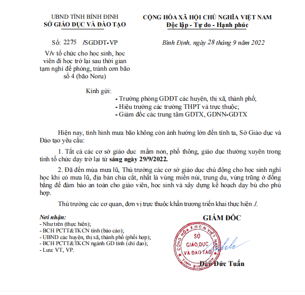 Tại Bình Định, vào ngày 28/9/2022, Sở GD&ĐT tỉnh Bình Định cũng có Công văn về việc tổ chức cho học sinh, học viên đi học trở lại sau thời gian tạm nghỉ để phòng, tránh cơn bão số 4 (bão Noru). Theo đó, tất cả các cơ sở giáo dục, mầm non, phổ thông, giáo dục thường xuyên trên địa bàn tỉnh sẽ tổ chức dạy học trở lại từ ngày 29/9.