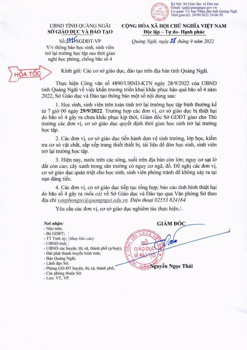 Tương tự Đà Nẵng và Bình Định, Quảng Ngãi cũng cho học sinh, sinh viên quay trở lại trường học tập bình thường kể từ 7h sáng ngày 29/9. Trường hợp các đơn vị, cơ sở giáo dục bị thiệt hại do bão số 4 gây ra chưa khắc phục kịp thời, Giám đốc Sở GD&ĐT giao cho thủ trưởng các đơn vị, cơ sở giáo dục quyết định thời gian học sinh trở lại trường học tập.