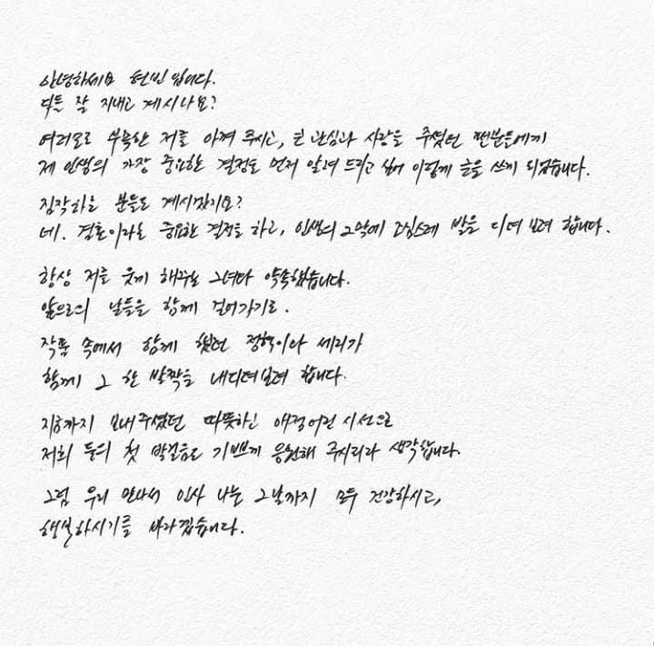 “Chắc cũng có bạn đoán được đúng không? Vâng. Tôi quyết định kết hôn. Tôi rất thận trọng khi bước vào chương mới của cuộc đời. Và tôi đã hứa với cô ấy là sẽ luôn làm cô ấy cười. Jeong Hyuk và Seri, những người đã cùng nhau đồng hành trong một tác phẩm, sẽ cùng nhau đồng hành trong chặng đường sắp tới.