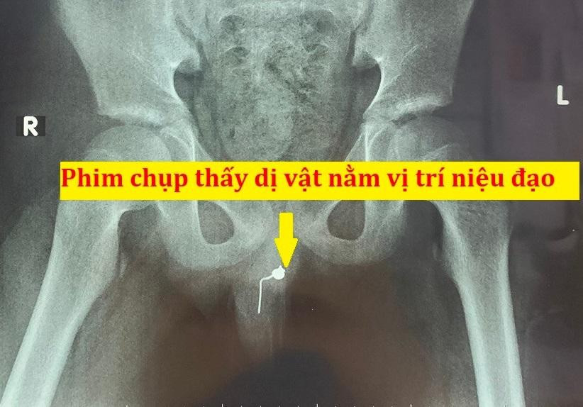 Người bố gặng hỏi thì bé thừa nhận trước đó đã tự nhét nam châm và kẹp giấy vào dương vật. Ngay lập tức, bệnh nhi được chuyển đến bệnh viện cấp cứu. Qua thăm khám và chụp X-quang bác sĩ ghi nhận hình ảnh dị vật cản quang ở vùng niệu đạo sau của bệnh nhi. Ngay sau nhập viện, bé được nội soi niệu đạo cấp cứu trong phòng mổ để lấy dị vật.