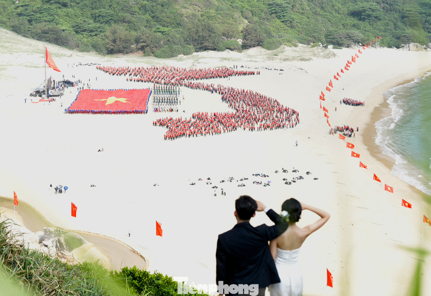 Từ Mũi Điện có thể nhìn toàn cảnh Bãi Môn, nơi diễn ra Lễ Thượng cờ Giải Vô địch Quốc gia Marathon và cự ly dài báo Tiền Phong lần thứ 65 - năm 2024. Đôi bạn trẻ, chàng trai Quốc Anh quê Đồng Tháp và vợ sắp cưới Quỳnh Anh đến từ Gia Lai, rất biết cách nắm bắt khoảnh khắc đặc biệt, khi lá đại kỳ được trải ra ở Bãi Môn, bên cạnh dáng hình Tổ quốc được tạo nên bởi 3.200 bạn trẻ Phú Yên.