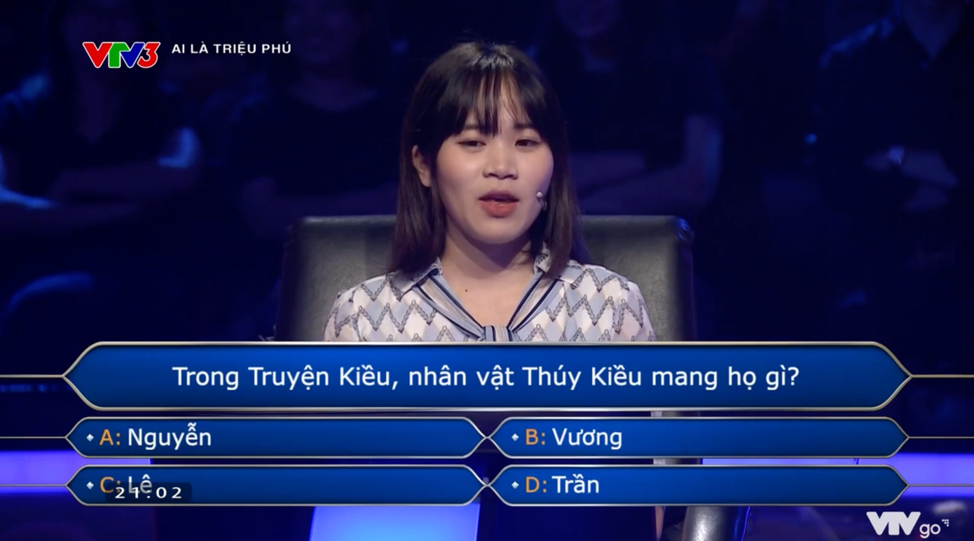 Cụ thể, câu hỏi số 6 với mốc phần thưởng là 3 triệu đồng có nội dung: "Trong Truyện Kiều, nhân vật Thúy Kiều mang họ gì?". Chương trình đưa ra 4 phương án cho người chơi lựa chọn bao gồm: "A. Nguyễn; B. Vương; C. Lệ; D. Trần".