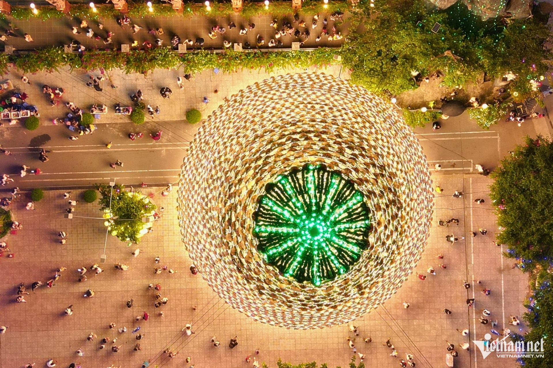 Mỗi tối, vào lúc 19h, cây thông “khổng lồ” cao gần 40m được tạo dựng từ hơn 3.800 chiếc nón lá truyền thống Việt Nam bắt đầu được lên đèn.