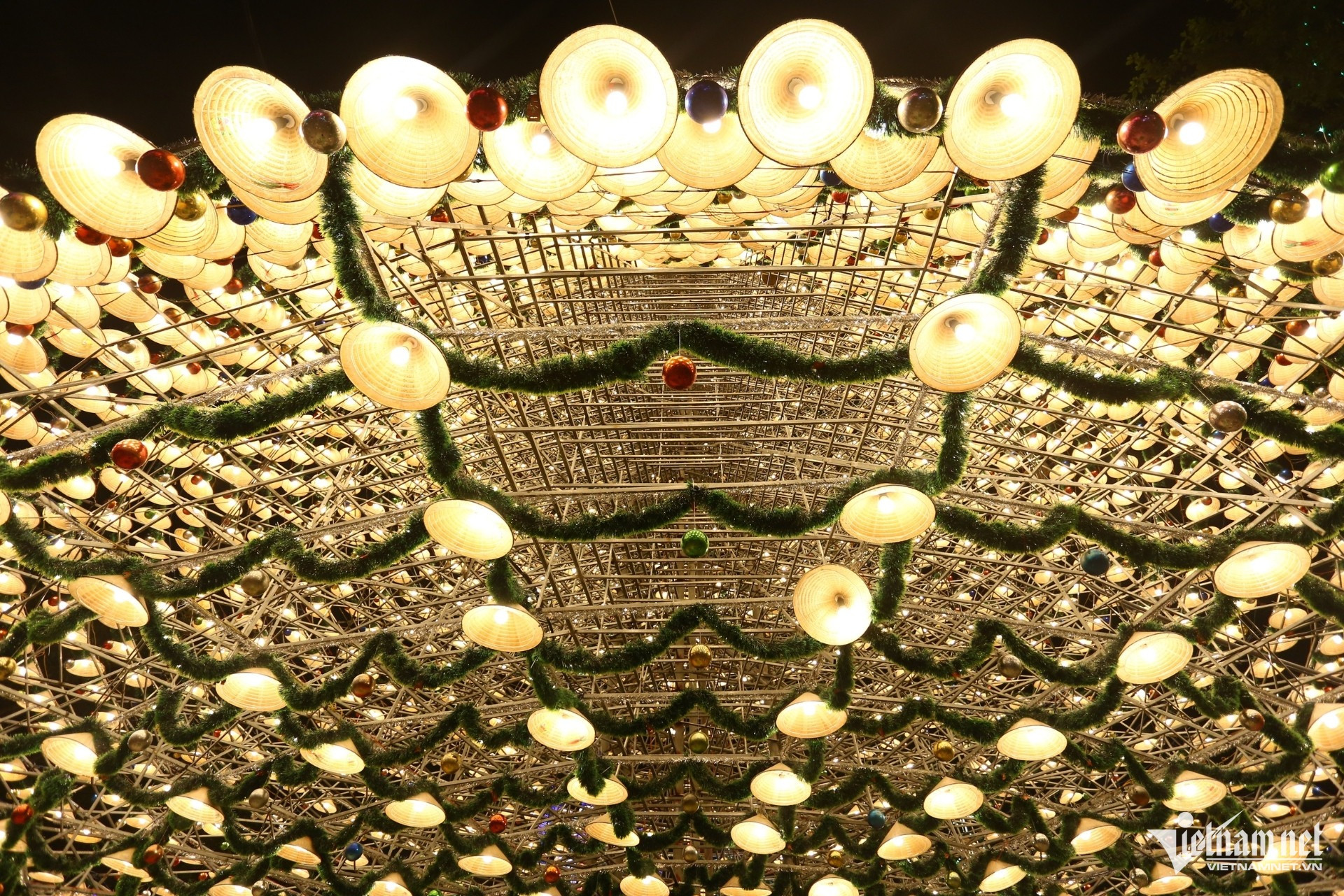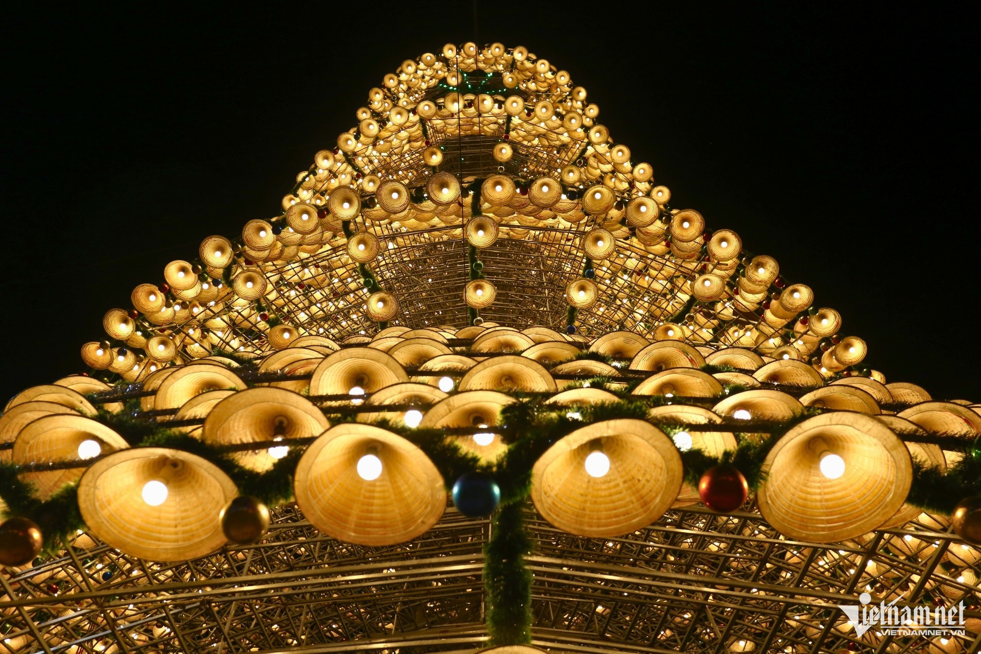 Những chiếc nón lá được xếp đặt khéo léo xung quanh bộ khung sắt nặng hàng tấn tạo thành hình cây thông Noel 4 tầng lung linh.