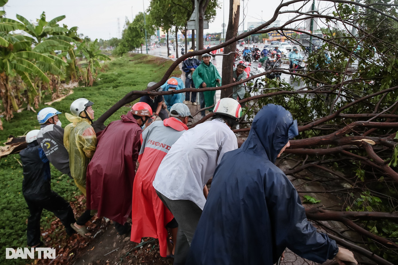 Ghi nhận của phóng viên Dân trí trên đường Phạm Văn Đồng (TP Thủ Đức), cơn mưa lớn đã khiến một nhánh cây xanh ngã ra đường, người dân đi ngang phải kéo cây lên vỉa hè để di chuyển.
