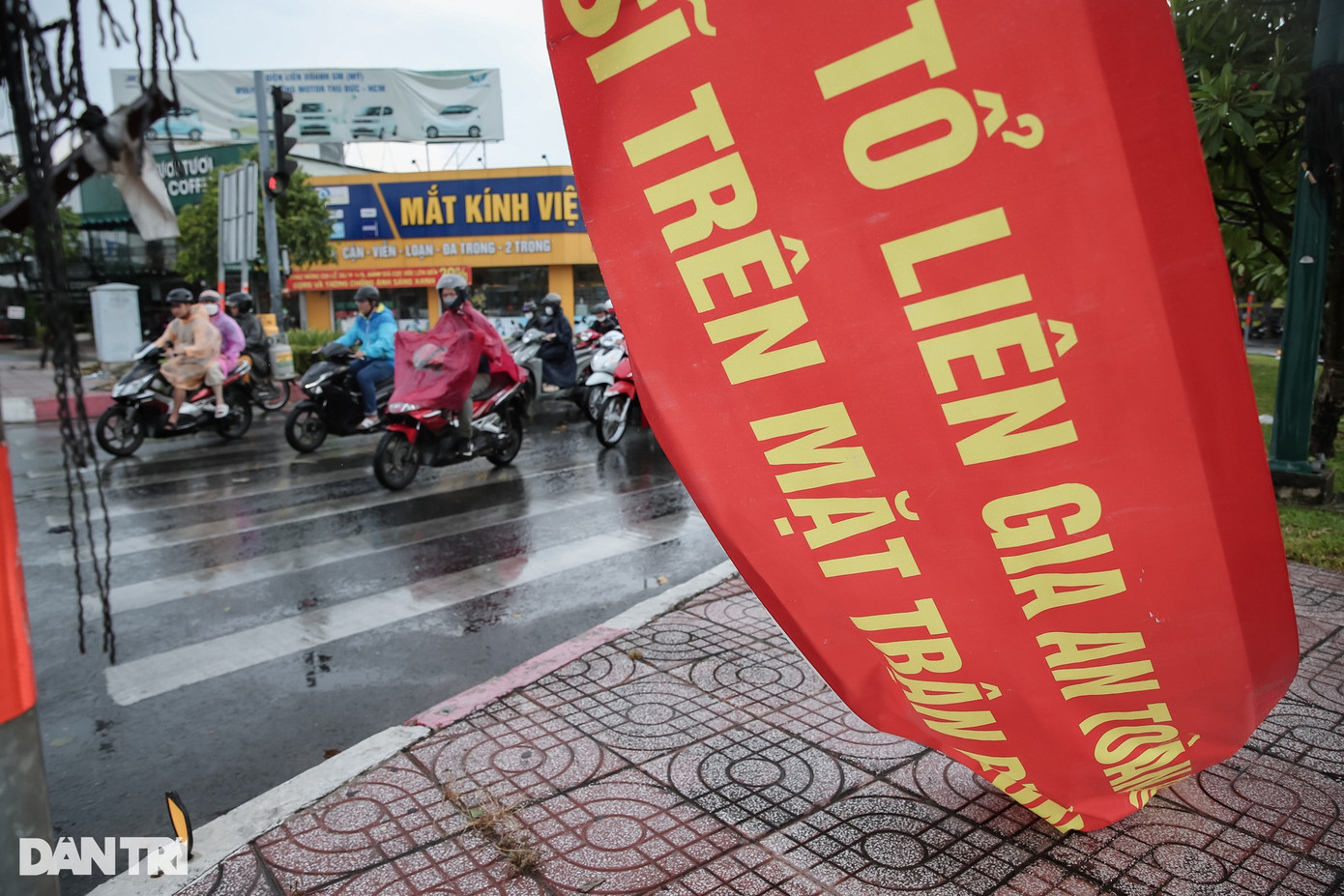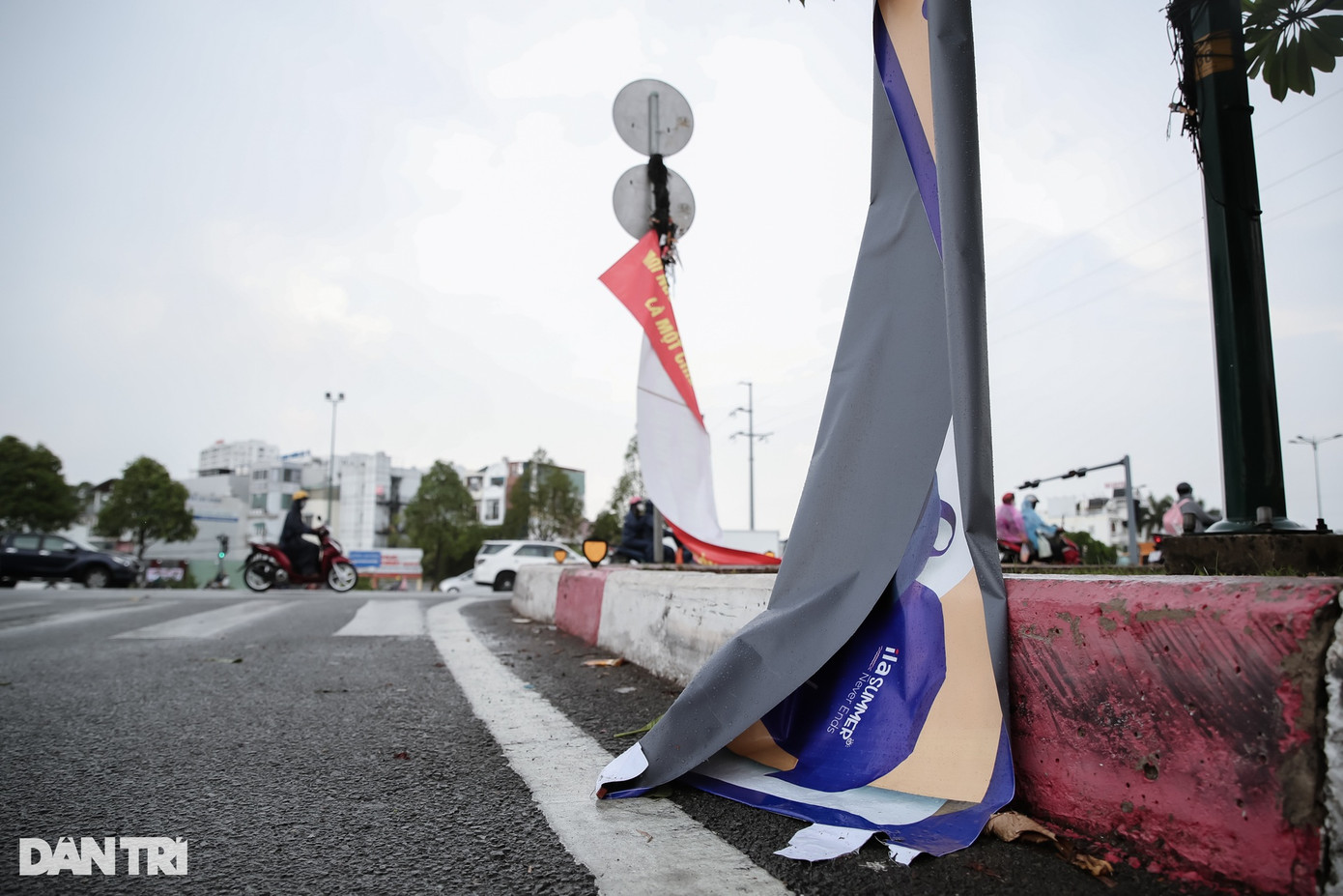 Nhiều biểu ngữ treo trên đường cũng bị hư hỏng, nằm lăn lóc sau cơn mưa.