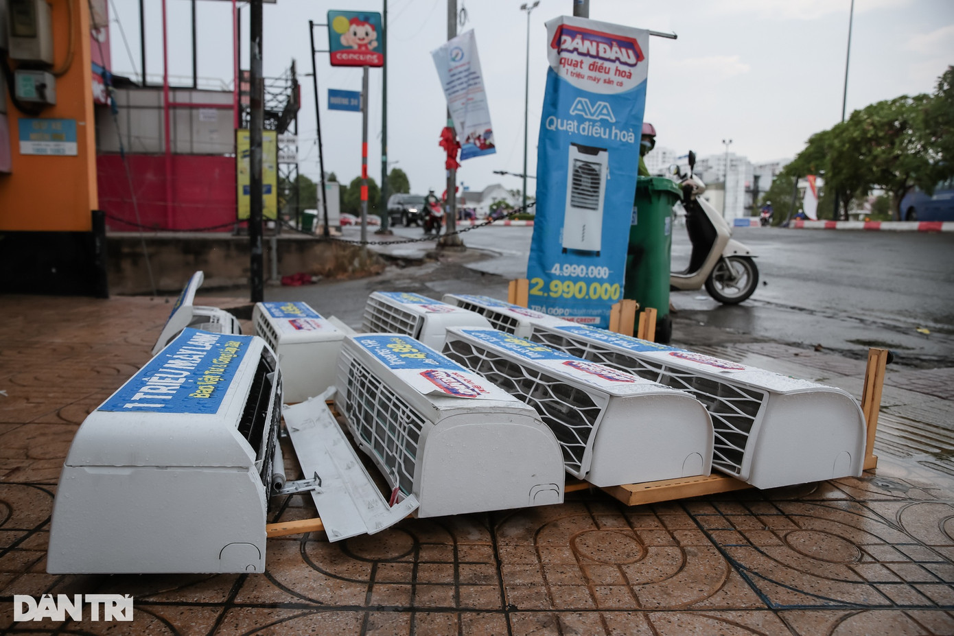 Một số thiết bị trưng bày trước tiệm cũng bị gió cuốn bay, hư hỏng sau cơn mưa.