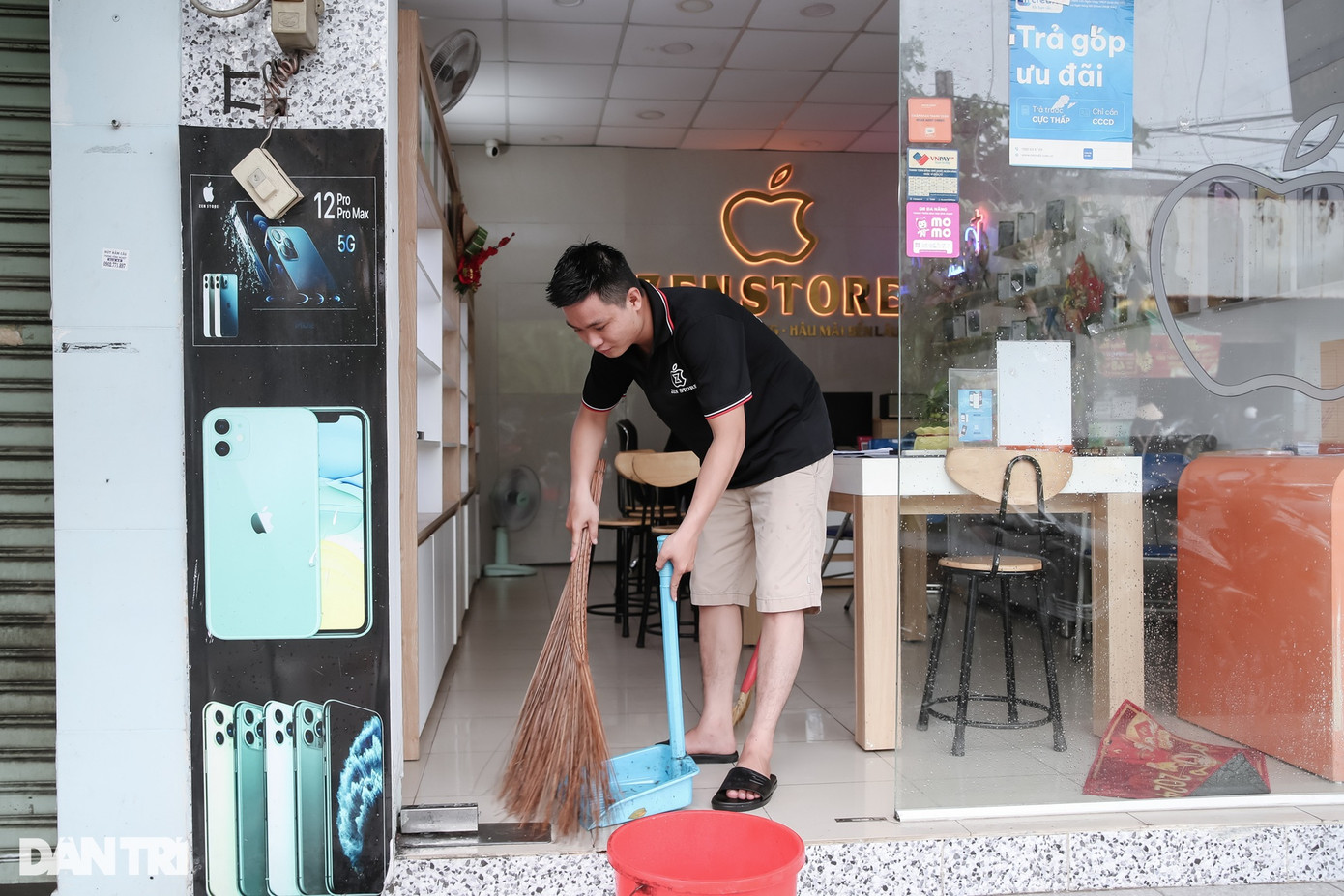Anh Trần Nguyễn Nhật Luật (27 tuổi), chủ một cửa hàng điện thoại trên đường Kha Vạn Cân, TP Thủ Đức, quét dọn lại những mảnh kính của chiếc cửa bị vỡ sau cơn mưa lớn giữa trưa.
