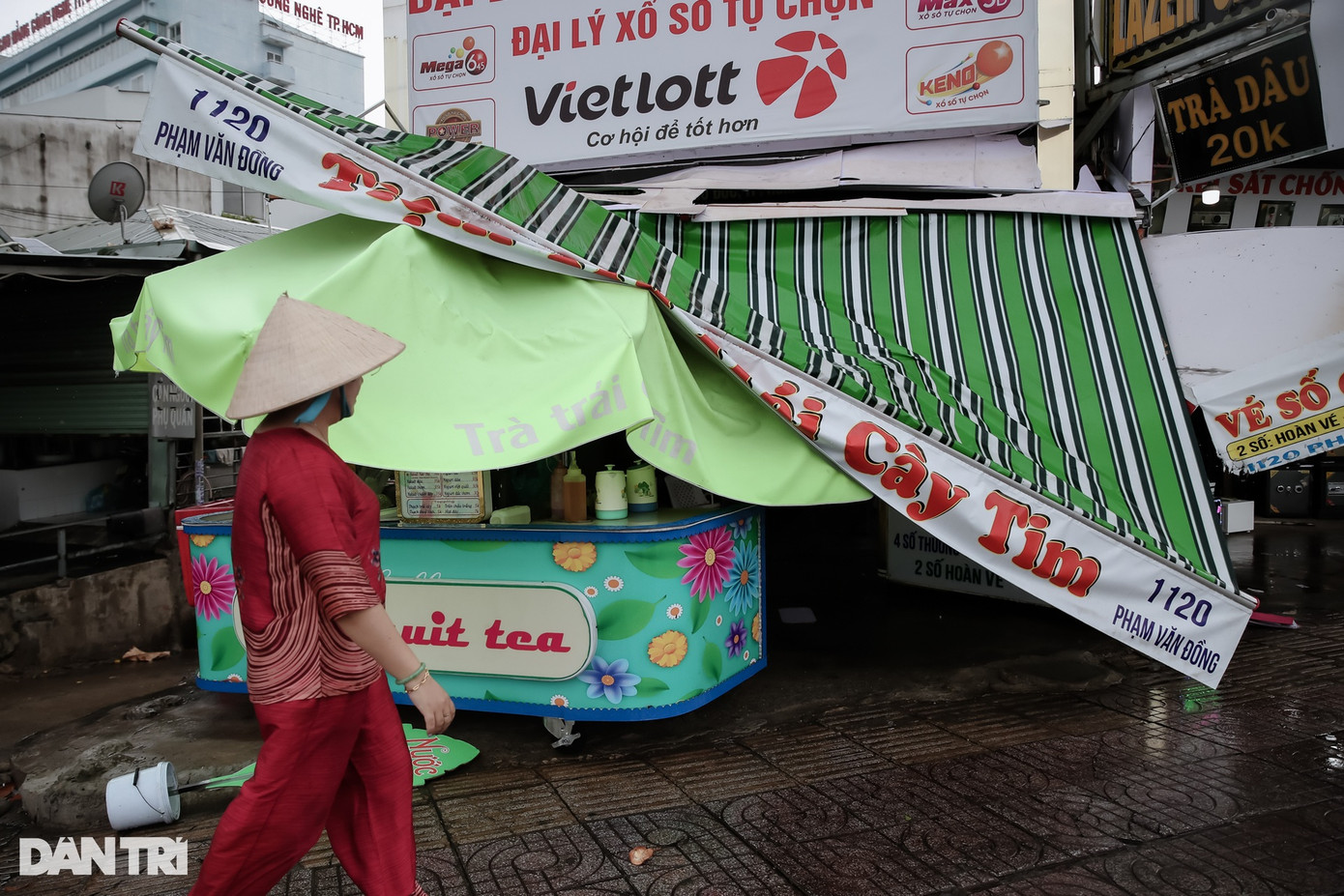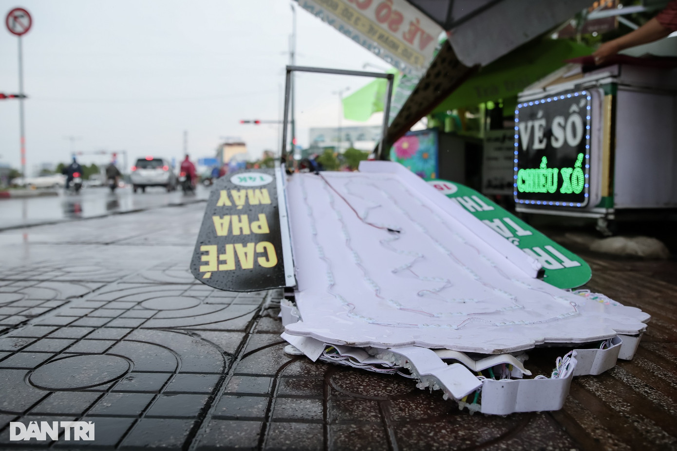 Một đại lý vé số trên đường Phạm Văn Đồng bị đổ phần mái che sau cơn mưa lớn giữa trưa.