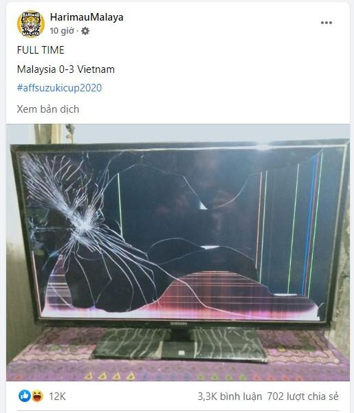 ĐT Việt Nam hoàn toàn chiếm giữ thế trận trong trận đấu gặp Malaysia. "Hổ Malaya" không thể lên bóng và chấp nhận để thua với tỉ số đậm. Trận thua tan tác khiến nhiều CĐV Malaysia tức giận. Theo hình ảnh được chia sẻ trên HarimauMalaya - fanpage gần 2 triệu lượt theo dõi của người hâm mộ Malaysia, một CĐV nước này đã không giữ được bình tĩnh và đập vỡ chiếc TV sau khi trận đấu kết thúc.
