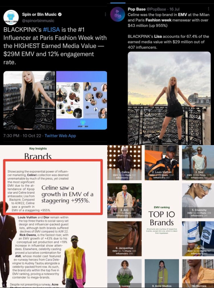 Lisa BLACKPINK liên tục đem lại giá trị truyền thông EMV (Earned Media Value) khủng cho nhà mốt Pháp: 29,1 triệu đôla (hơn 720 tỷ đồng) tại Paris Fashion Week Menswear Spring - Summer 2023, 14,7 triệu đôla (hơn 354 tỷ đồng) tại Liên hoan phim CANNES năm 2023…