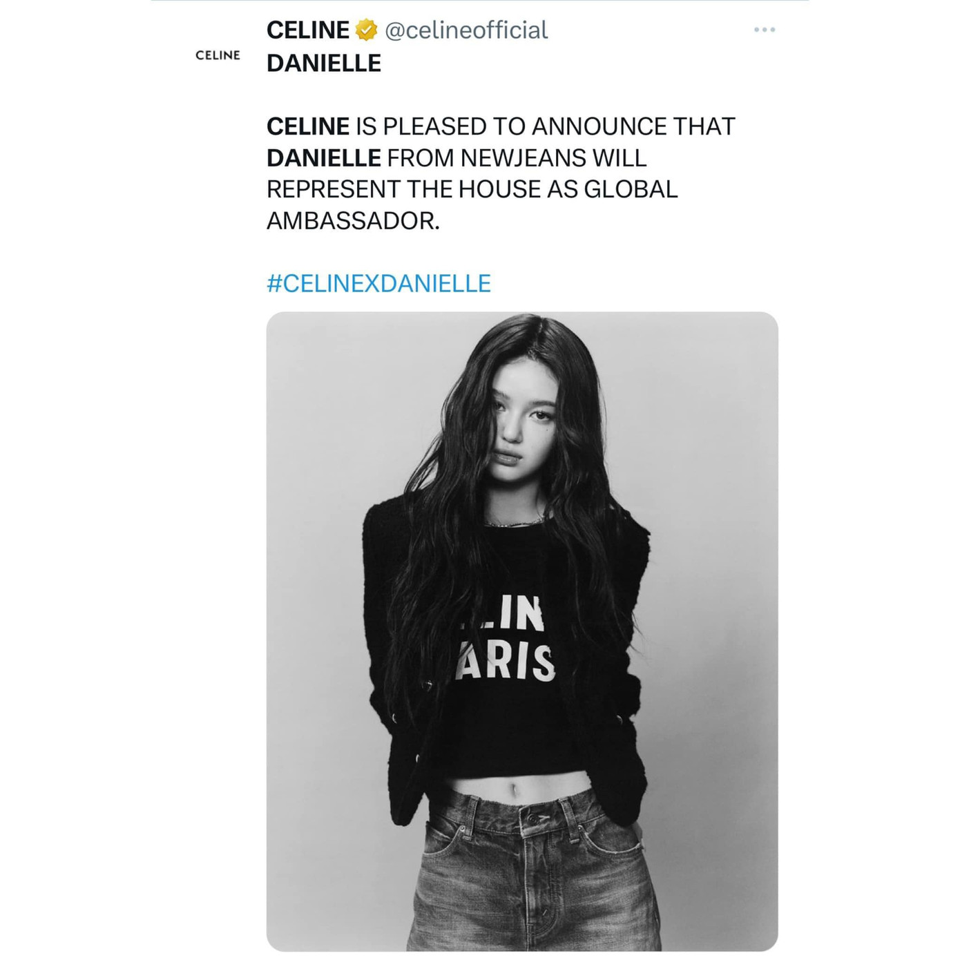 Ngày 22/3, CELINE chính thức công bố Danielle (NewJeans) là Đại sứ toàn cầu của thương hiệu. Nhiều người hâm mộ gửi lời chúc mừng tới nữ idol sinh năm 2005. Mỹ nhân lai vừa kết thúc hợp đồng đại sứ với BURBERRY cách đây không lâu và mới chỉ tiếp xúc với CELINE trong khoảng 1 tháng gần đây.