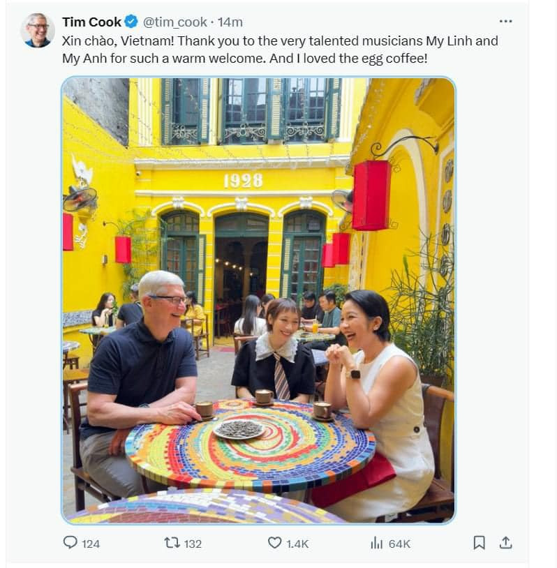 Đáng chú ý, CEO Tim Cook còn chia sẻ trên X (Twitter) ảnh chụp với ca sĩ Mỹ Linh và con gái Mỹ Anh kèm lời chào: "Xin chào, Việt Nam! Cảm ơn những nghệ sĩ tài năng Mỹ Linh và Mỹ Anh vì sự chào đón nồng nhiệt. Và tôi yêu café trứng!".
