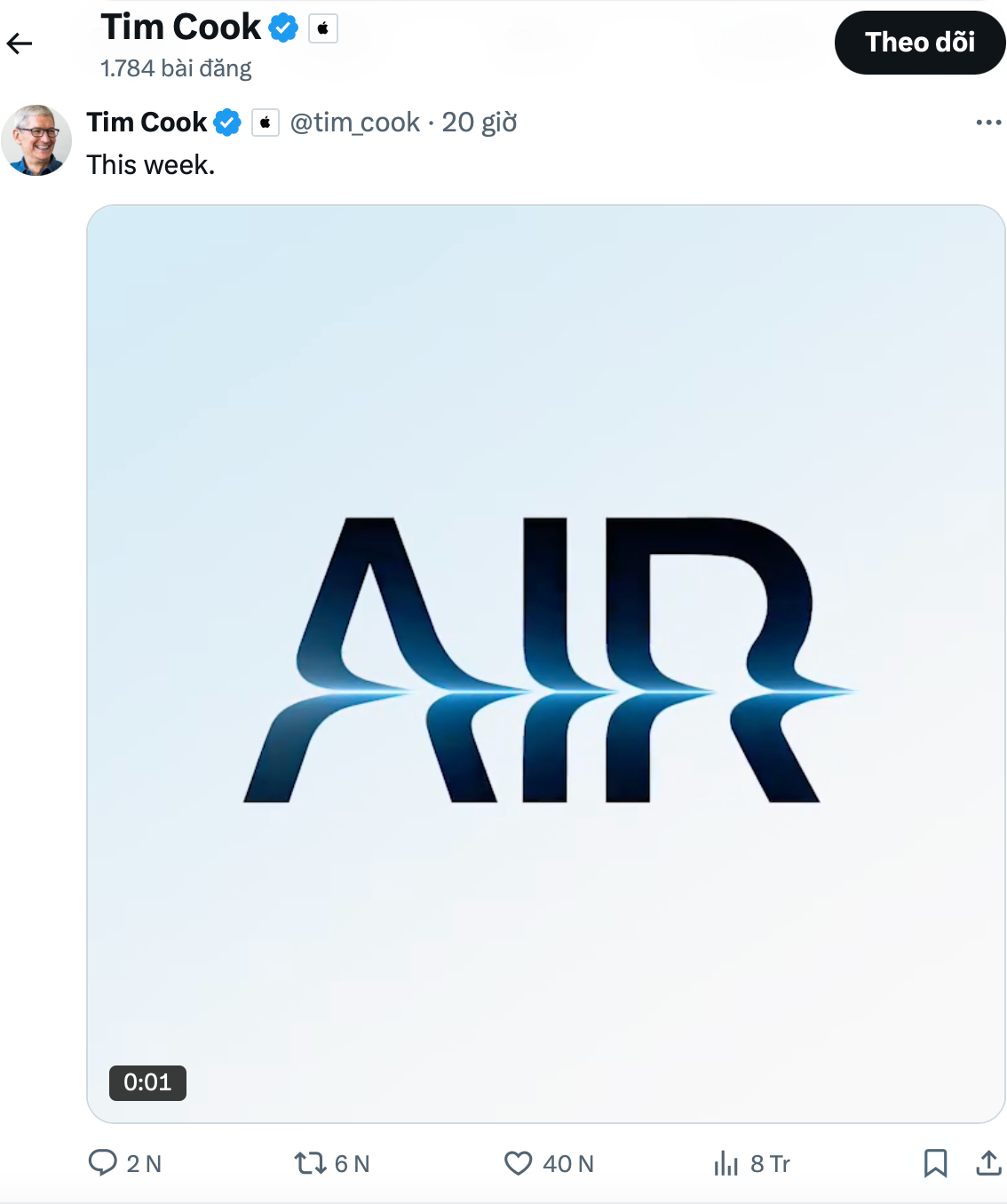 Trong đoạn video do CEO Tim Cook đăng tải, dòng chữ "There's something in the air" (tạm dịch: "Có điều gì đó trong không khí") xuất hiện trên màn hình, trước khi bị cắt ngang bởi một đường nét siêu mỏng. Chi tiết gợi ý mạnh mẽ về một thiết bị mới, có thể là MacBook Air M4.