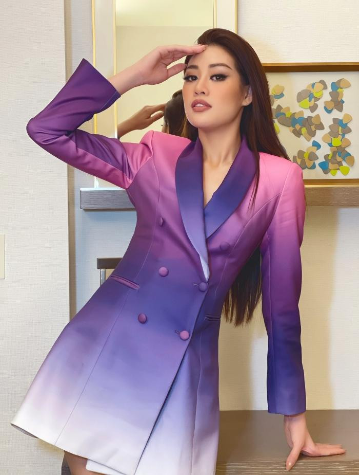 Có vẻ như nhận thức được sai lầm này, lần livestream thứ 2 trên fanpage Sash Factor, trò chuyện cùng bà Angela - CEO của One Body Village và người hâm mộ quốc tế, Hoa hậu Khánh Vân thay đổi phong cách. Cô mặc mẫu váy màu tím ombre dáng vest của một thương hiệu trong nước, rất thanh lịch nhưng không kém phần nổi bật.