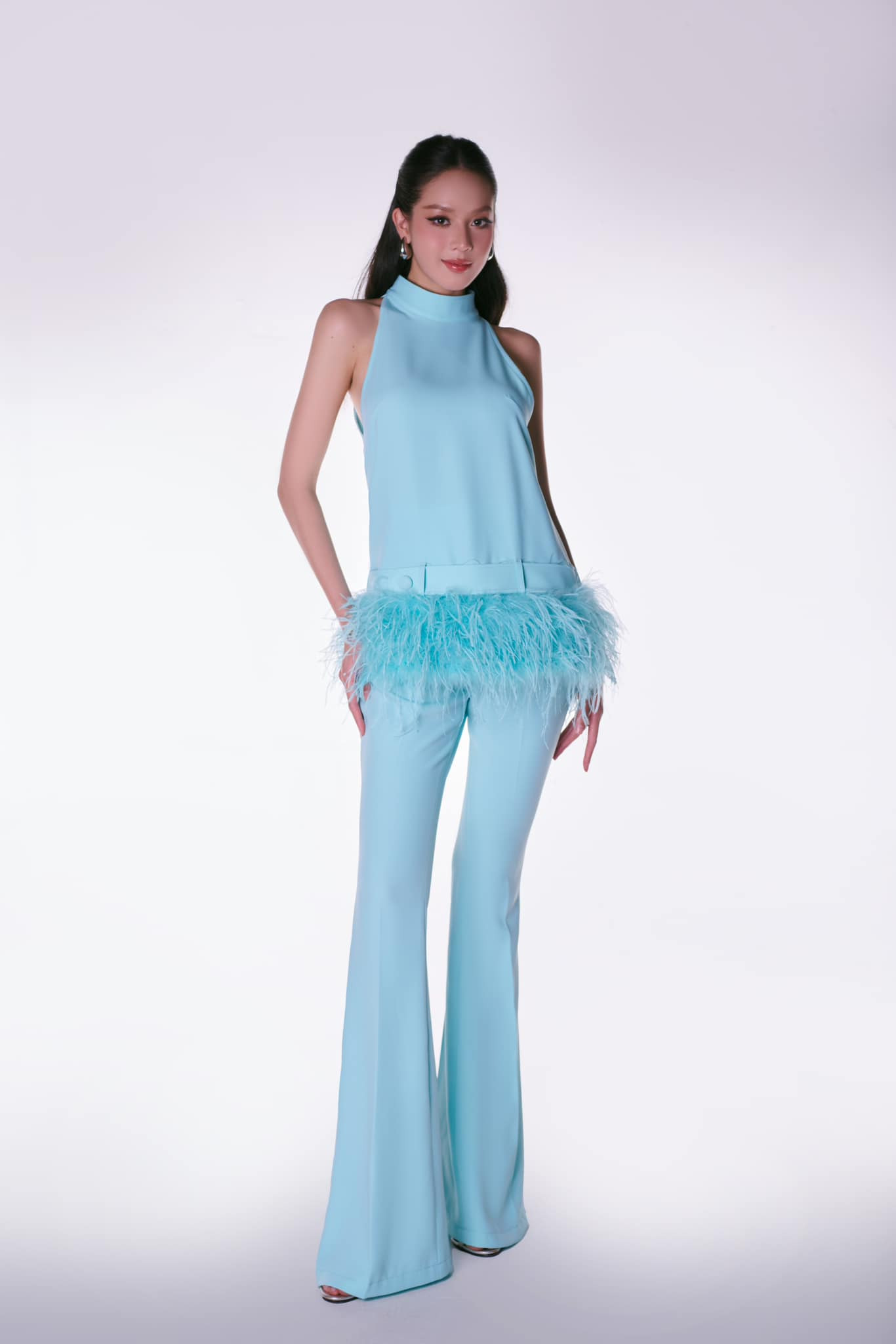 Khi hạ cánh xuống Nhật Bản, Thanh Thủy đã nhanh chóng thay sang set đồ màu xanh da trời đầy ngọt ngào. Chiếc áo cổ yếm khoe khéo xương quai xanh thanh tú của nàng hậu, trong khi chiếc quần ống loe giúp đôi chân thêm dài.