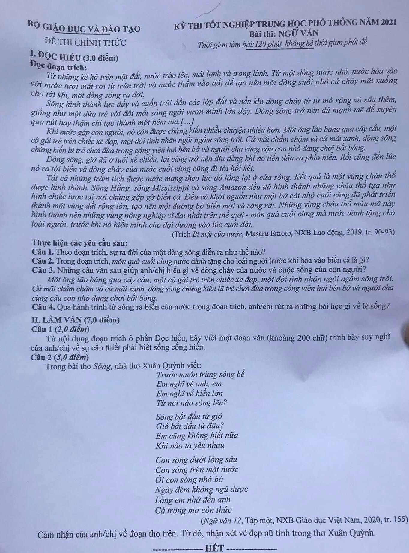 Đề thi môn Ngữ văn tốt nghiệp THPT năm 2021 như sau: