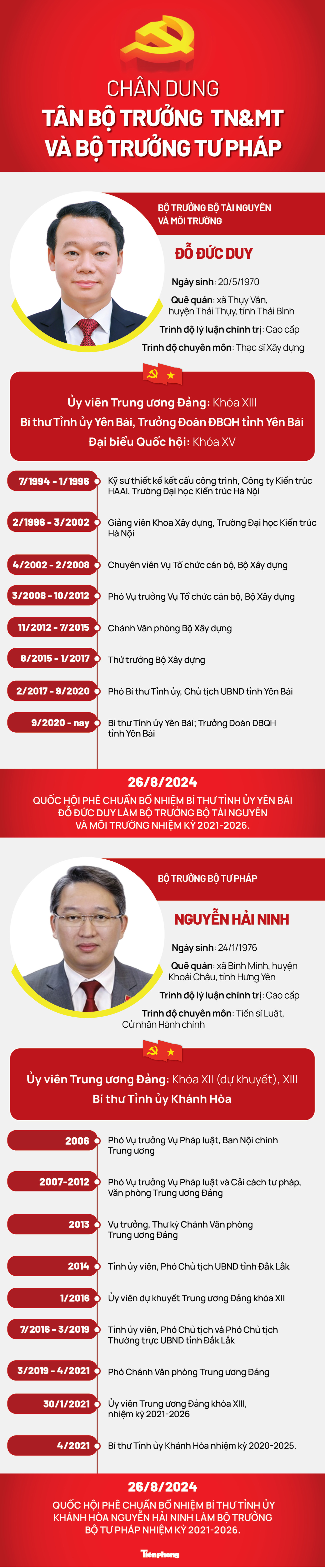TPO - Ngày 26/8, Quốc hội phê chuẩn bổ nhiệm Bí thư Tỉnh ủy Yên Bái Đỗ Đức Duy làm Bộ trưởng Bộ Tài nguyên và Môi trường; Bí thư Tỉnh ủy Khánh Hòa Nguyễn Hải Ninh làm Bộ trưởng Bộ Tư pháp nhiệm kỳ 2021-2026.
