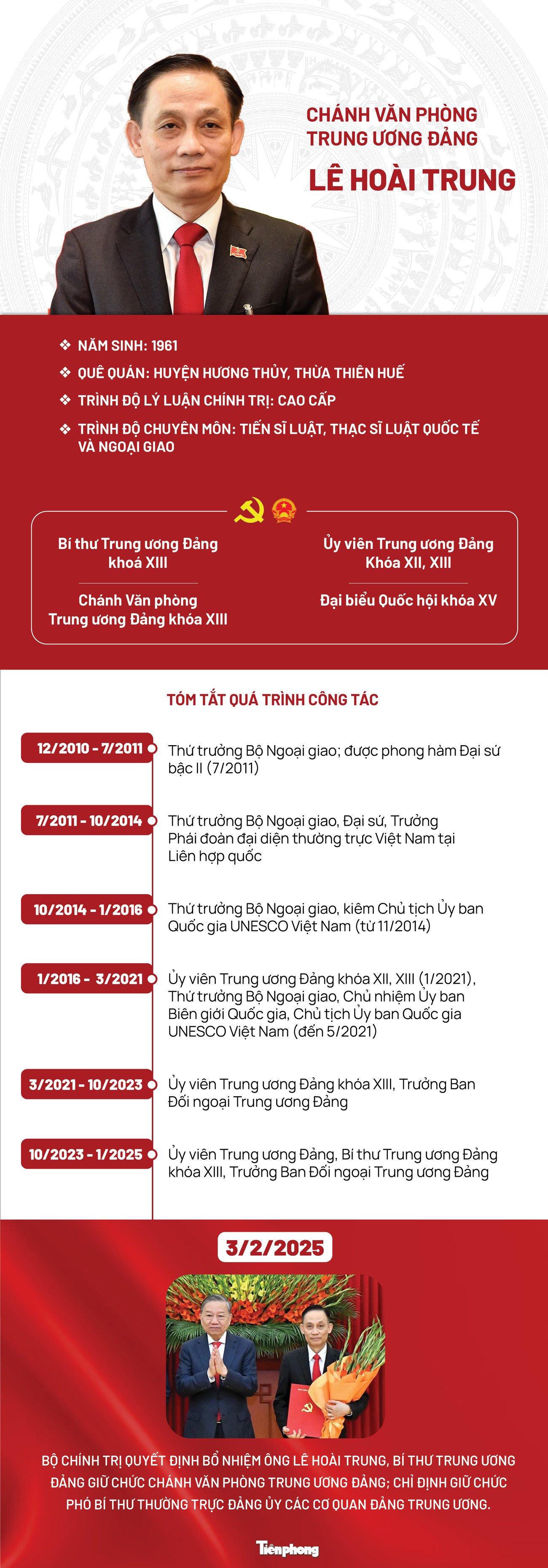 TPO - Ngày 3/2/2025, Bộ Chính trị quyết định bổ nhiệm ông Lê Hoài Trung, Bí thư Trung ương Đảng giữ chức Chánh Văn phòng Trung ương Đảng; chỉ định giữ chức Phó Bí thư Thường trực Đảng ủy các cơ quan đảng Trung ương.
