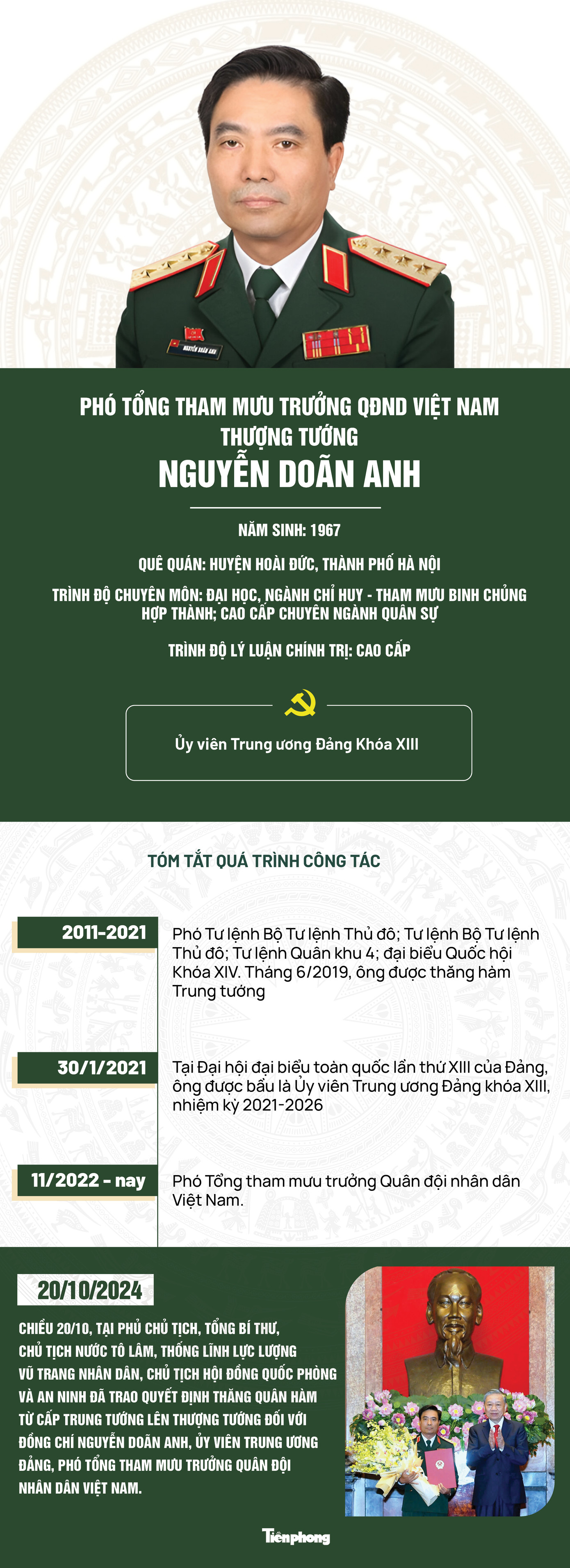 Ngày 20/10/2024, Phó Tổng tham mưu trưởng Quân đội nhân dân Việt Nam Nguyễn Doãn Anh được Tổng Bí thư, Chủ tịch nước Tô Lâm trao Quyết định thăng quân hàm Thượng tướng.