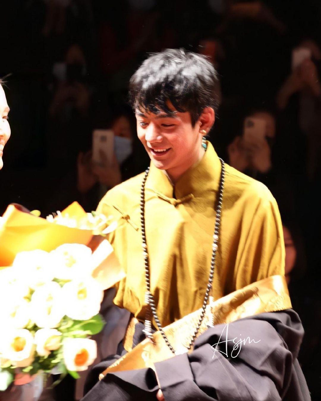 Tham gia với vai trò vedette, nam thanh niên 20 tuổi mặc đồ truyền thống lấy cảm hứng từ Hang đá Vân Cương, sải bước trên sàn catwalk với nụ cười rạng ngời thường thấy và tặng hoa cho nhà thiết kế.