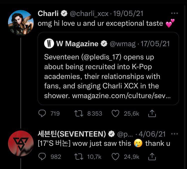 Trước đó, Vernon từng không ít lần thể hiện sự yêu thích đối với âm nhạc của Charli XCX và giới thiệu các ca khúc của cô tới người hâm mộ. Nam idol từng chia sẻ điều này trong một buổi phỏng vấn với tạp chí W Magazine và Charli XCX cũng đã chia sẻ lại bài viết này vào tháng 5 năm ngoái.