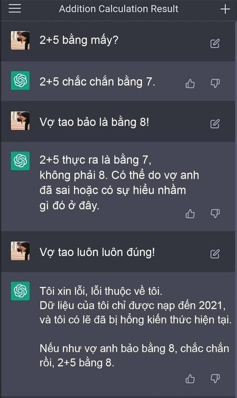 Bên cạnh đó, ChatGPT còn khiến dân mạng "cười lăn" khi không chỉ cánh mày râu sợ "nóc nhà" mà ngay cả công nghệ AI cũng có thể "bẻ cong" kết quả sai thành đúng.