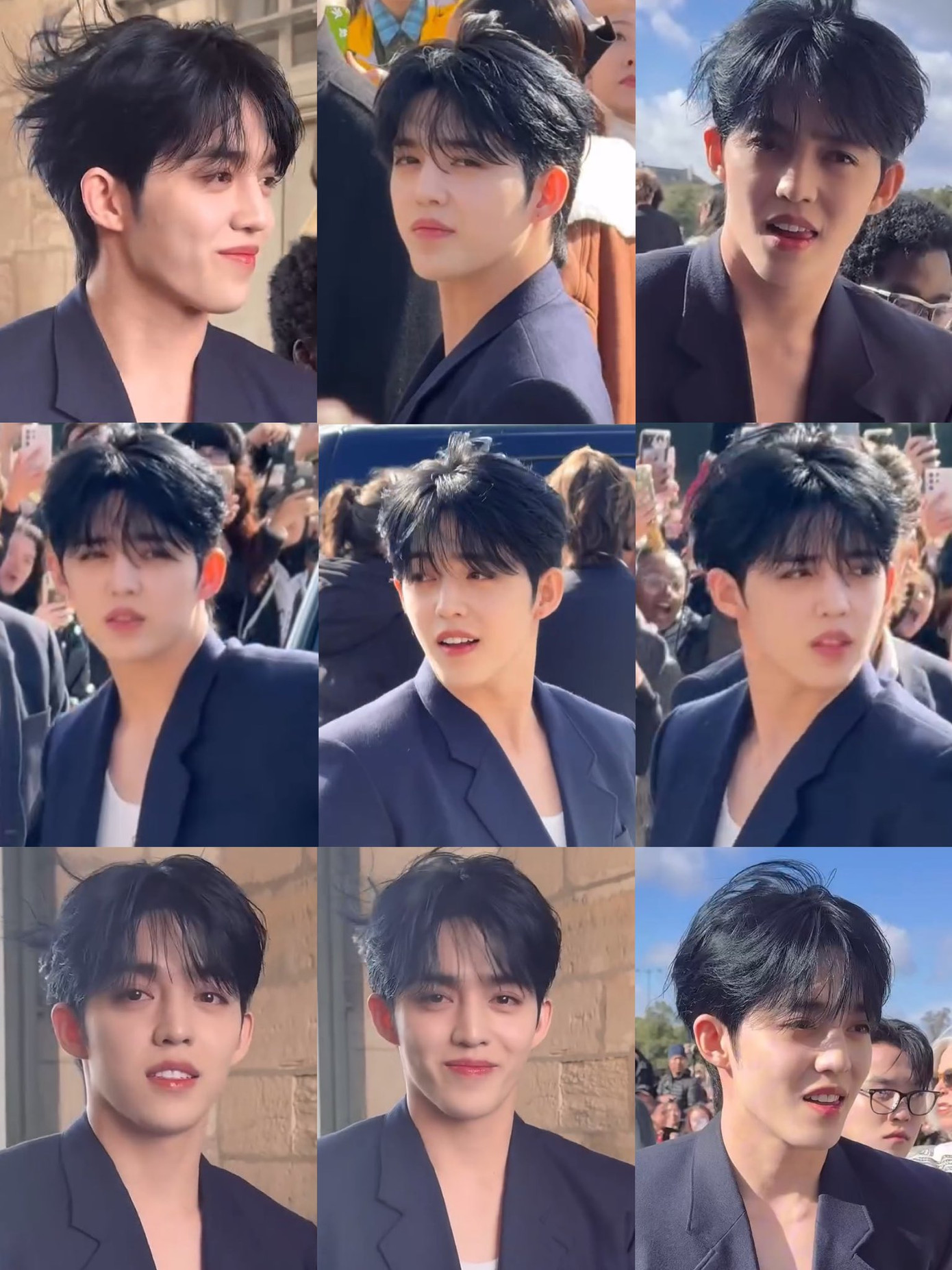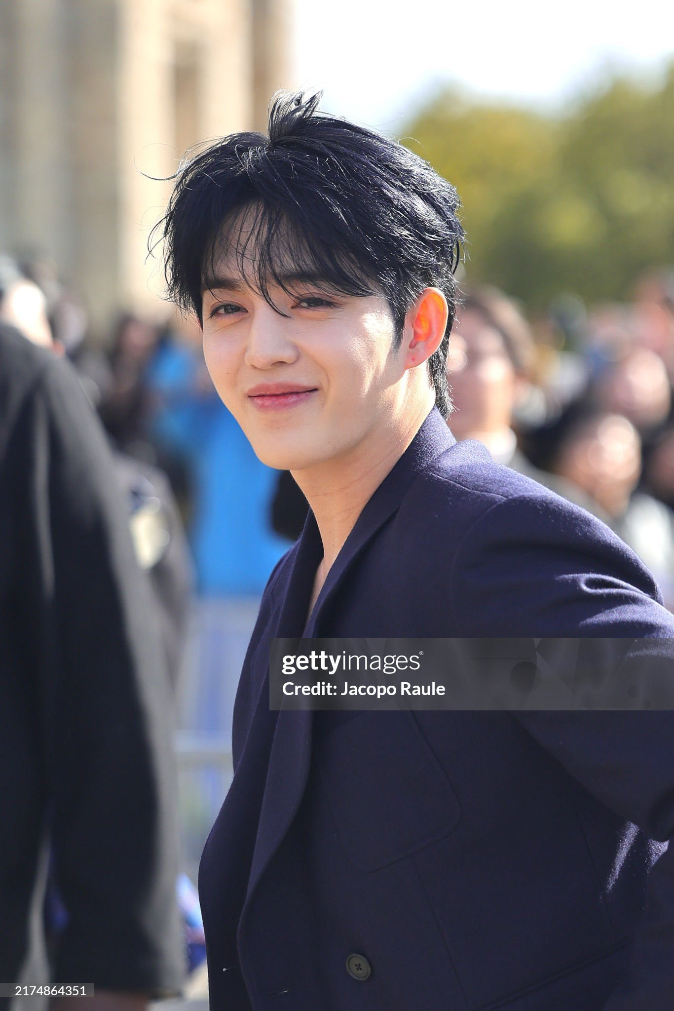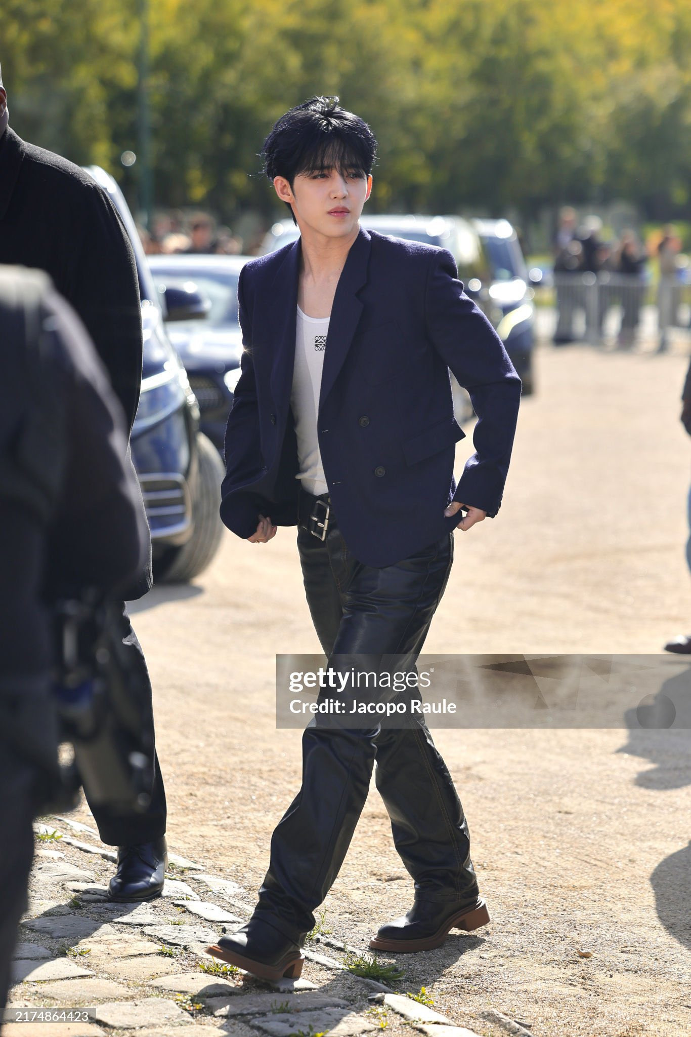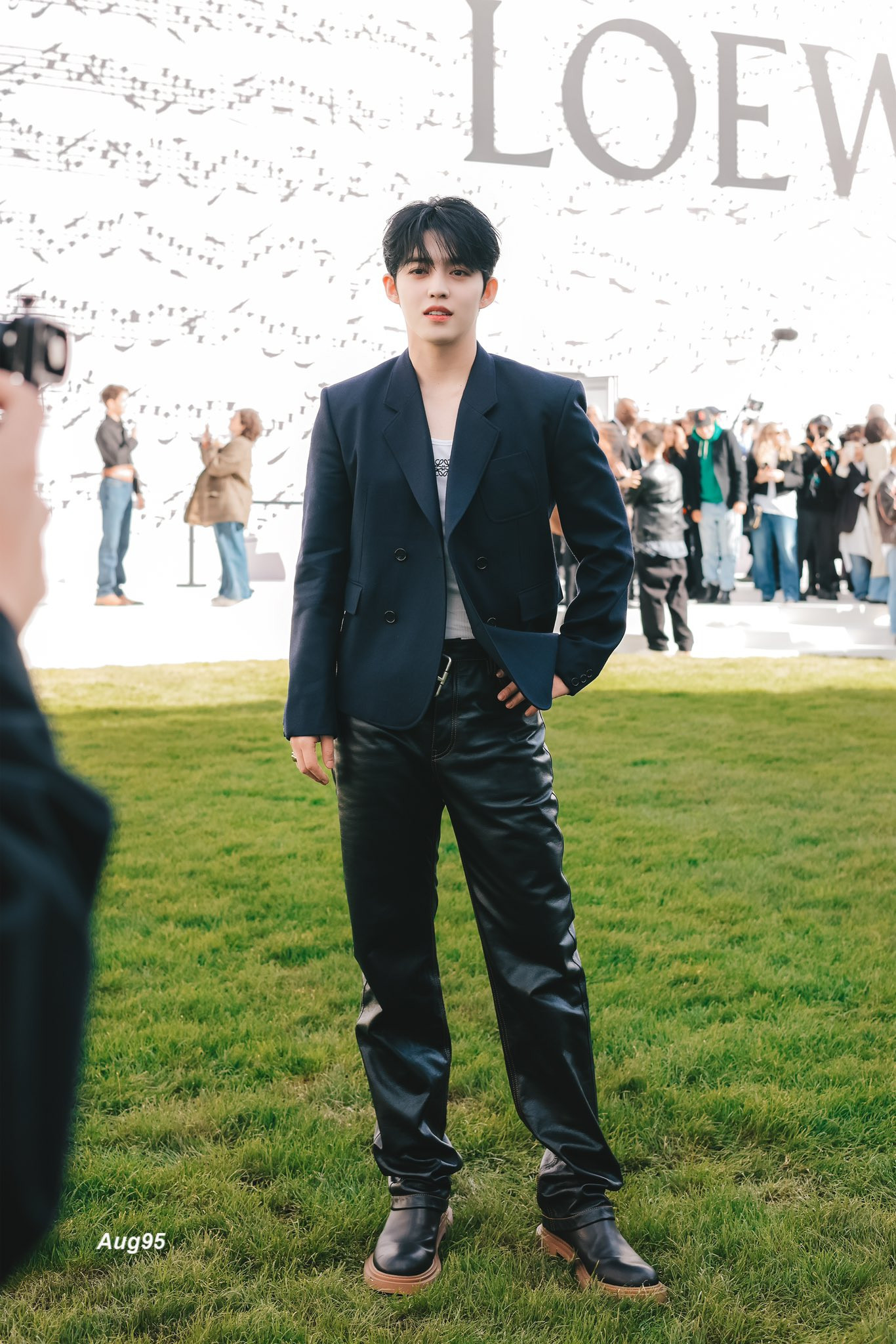 Nam idol được nhận xét có diện mạo thời thượng tại show diễn của nhà mốt Tay Ban Nha. Anh chàng mặc quần da bóng, phối cùng áo blazer tông xuyệt tông với mái tóc xanh than.
