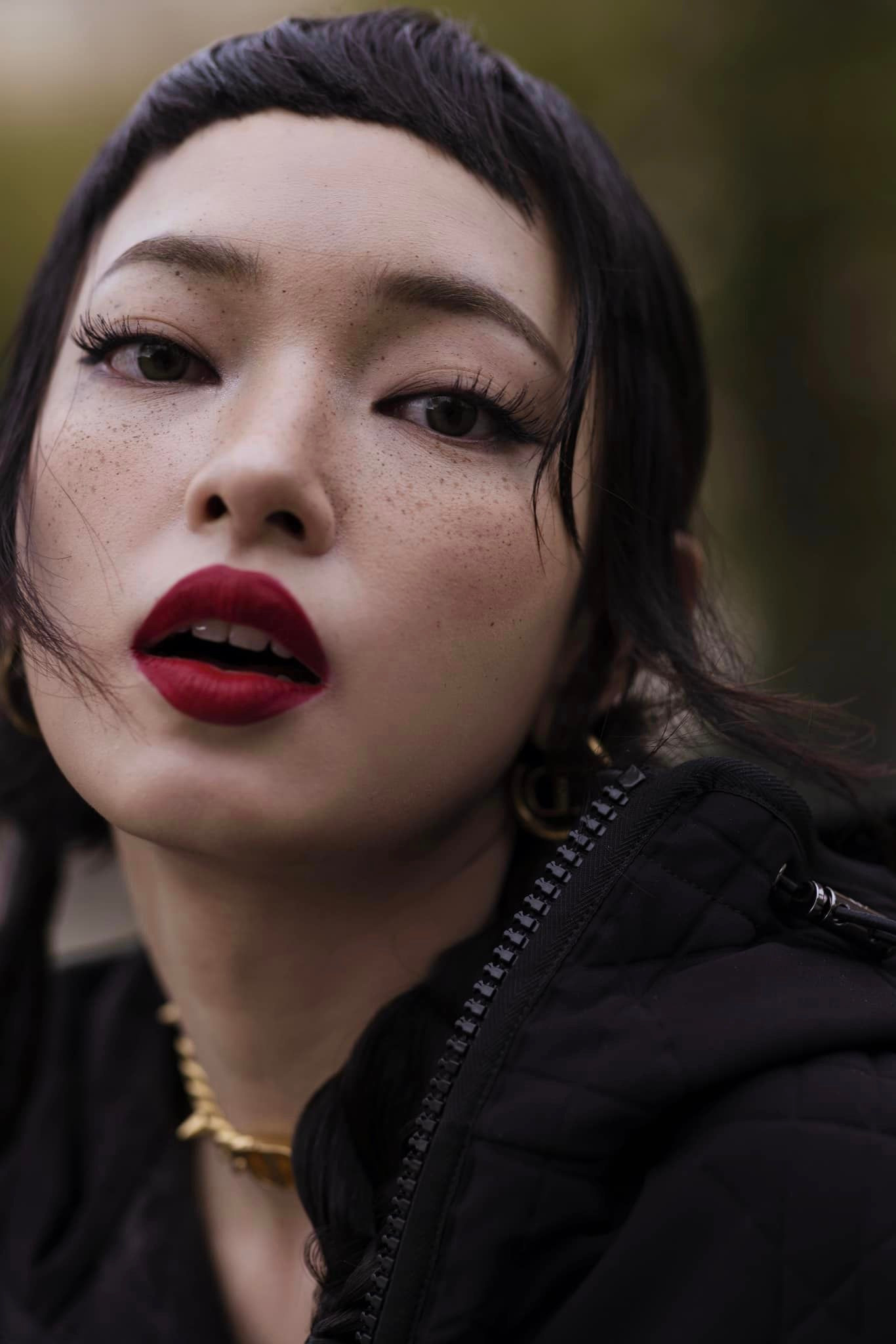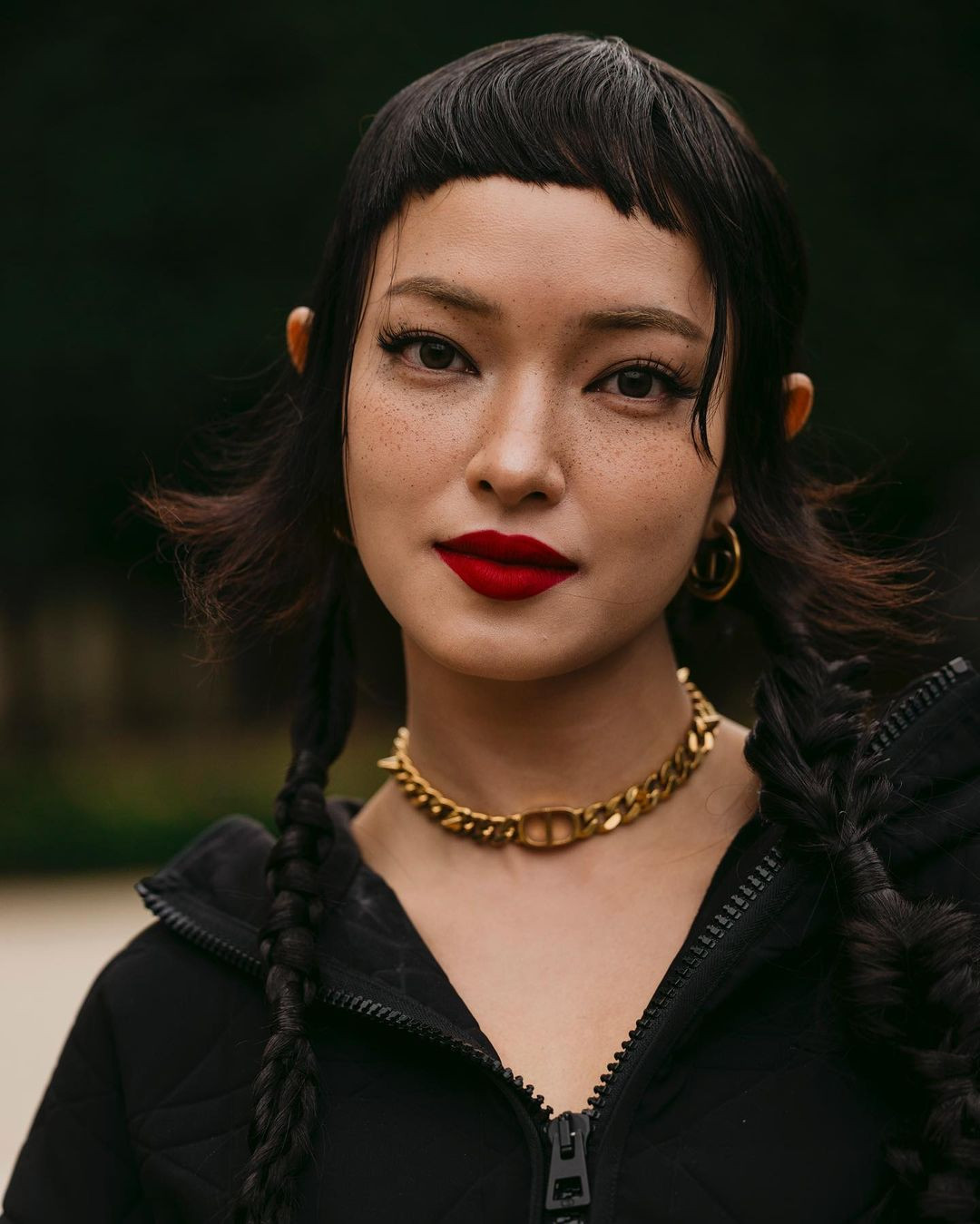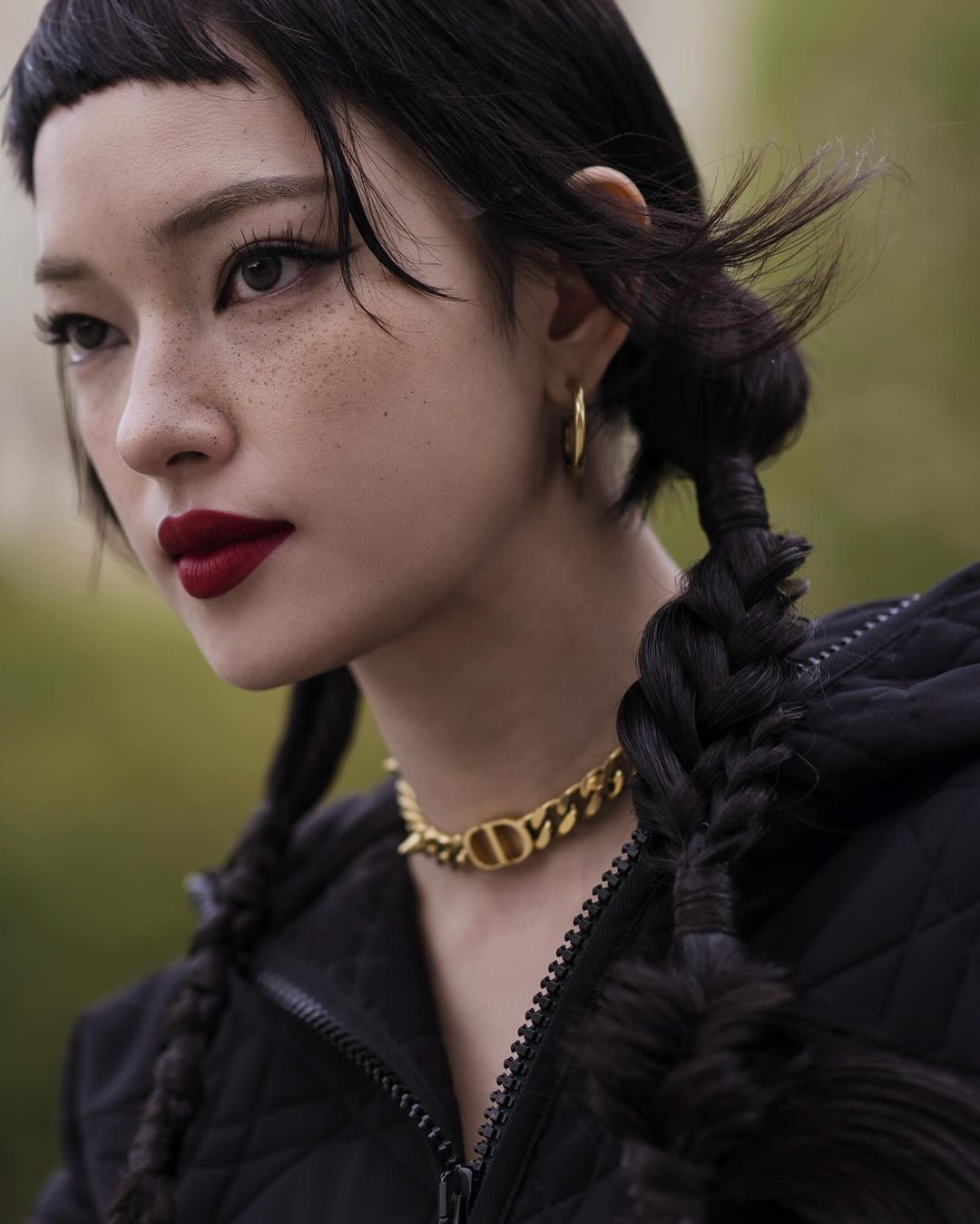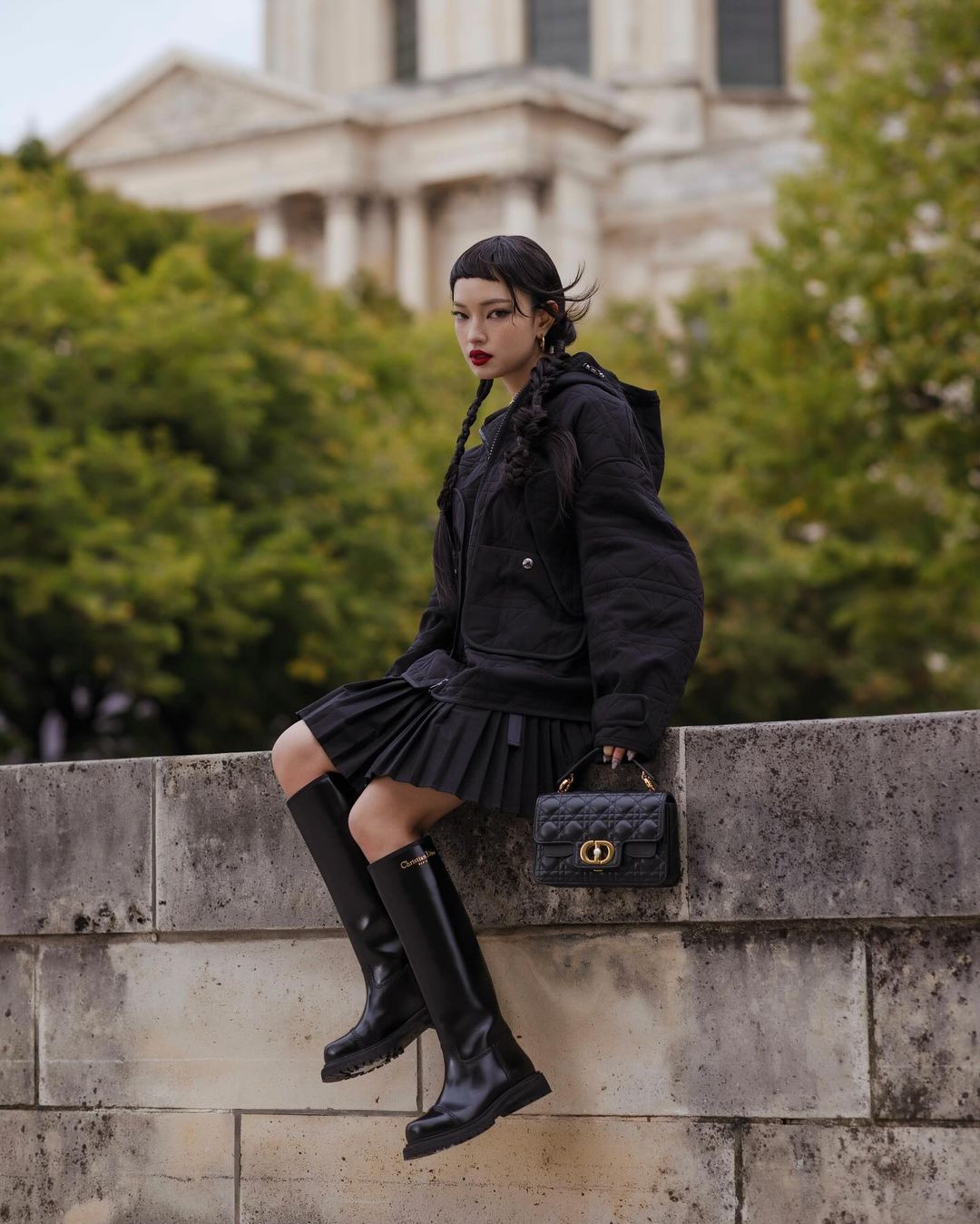 Trong lịch trình đầu tiên thuộc khuôn khổ Paris Fashion Week, Châu Bùi xuất hiện với tạo hình đậm chất châu Á tại show diễn của nhà mốt Dior. Bạn gái Binz có mặt tại sự kiện trong trang phục tông đen, phối áo khoác oversized, chân váy xếp ly cùng bốt cao cổ.