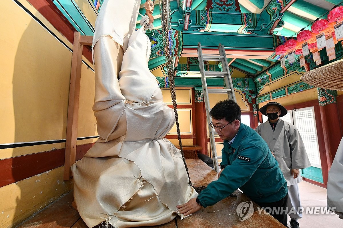 | Tượng phật và các cổ vật ở chùa Gounsa được đưa đến nơi an toàn. (Ảnh: Yonhap) |