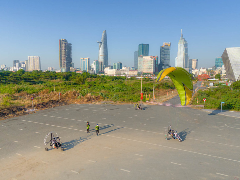 Theo phi công - huấn luyện viên dù lượn Trần Hùng Thắng, những ngày này, thời tiết tại TP Thủ Đức rất thuận lợi để bay dù lượn động cơ. Dù lượn có động cơ (paramotor) khác với loại không động cơ là có thể cất cánh không cần điểm cao, ít phụ thuộc vào gió. Dù lượn có các dây điều khiển hướng bay, đặc biệt còn có cần điều khiển ga cho động cơ gắn sau lưng để thay đổi tốc độ cánh quạt.