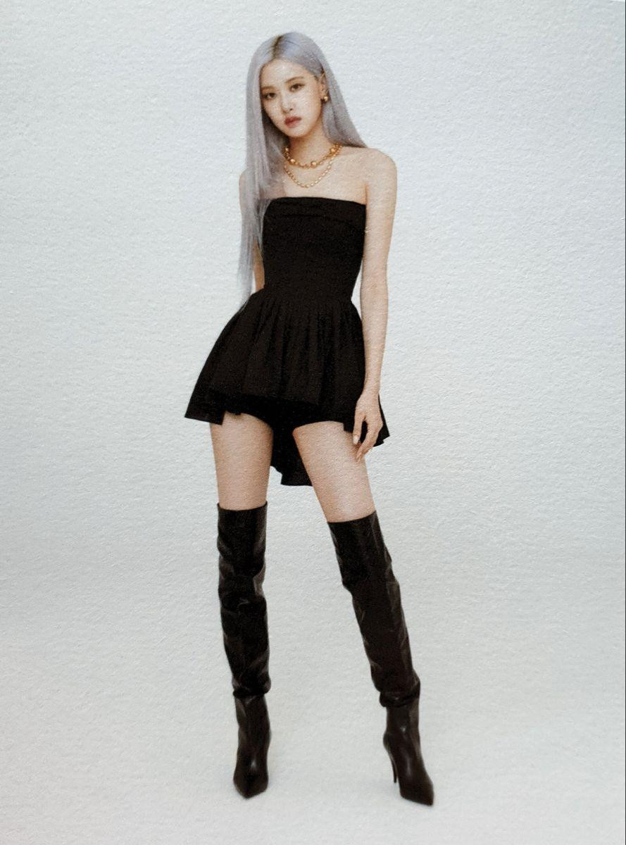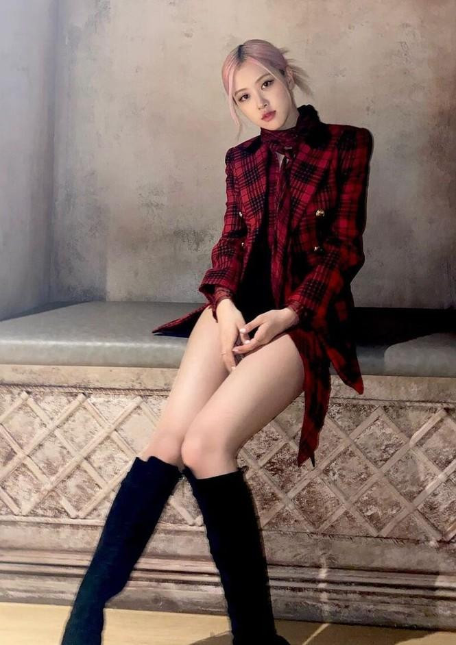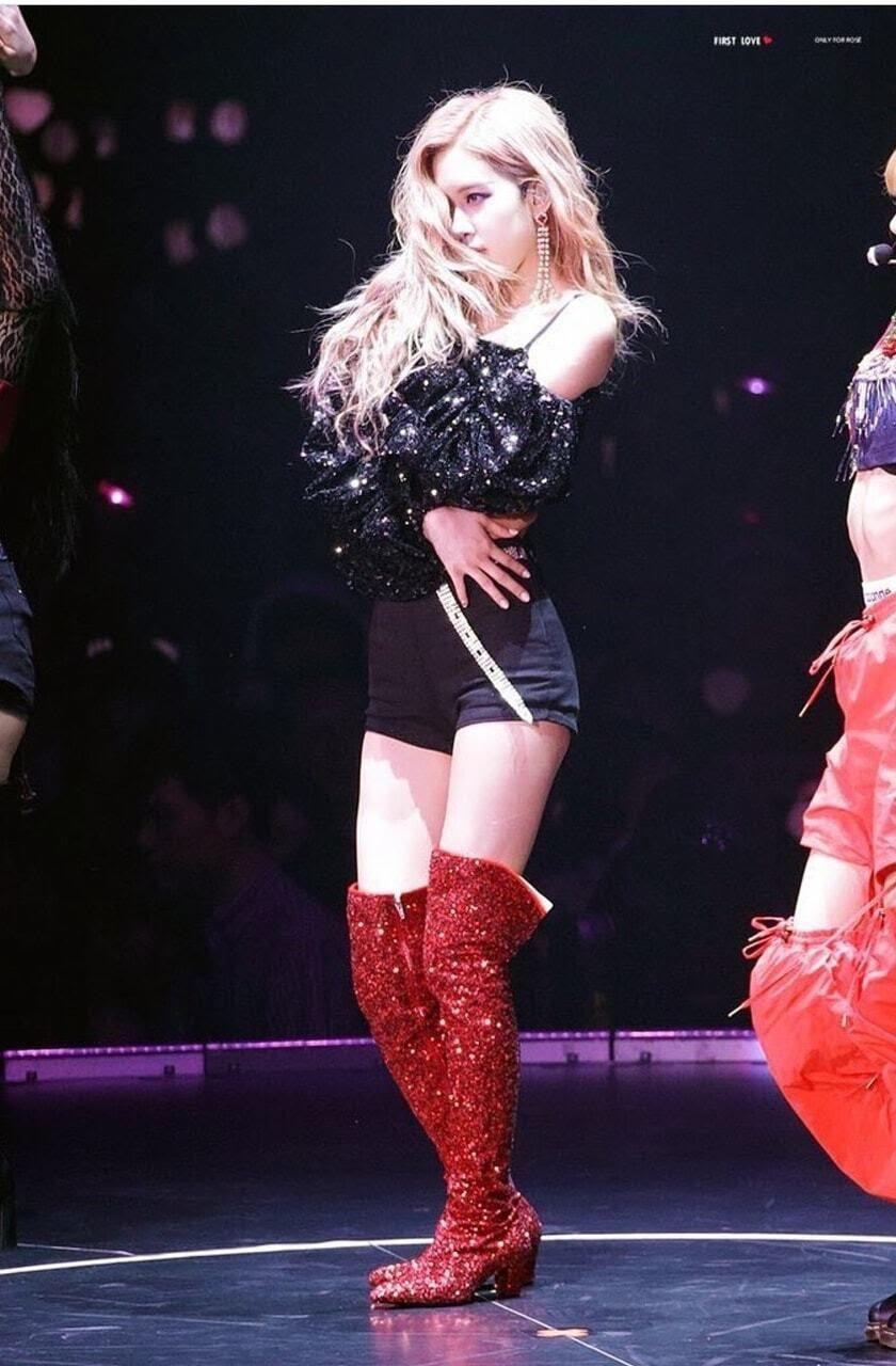 Những đôi boots cao cổ đã gắn liền với hình ảnh của Rosé, cùng cô xuất hiện trên sân khấu biểu diễn, chụp ảnh tạp chí hay tại các sự kiện. Netizen đã quen nhìn Rosé đầy sành điệu với quần soóc hoặc váy siêu ngắn kèm boots cao quá gối.