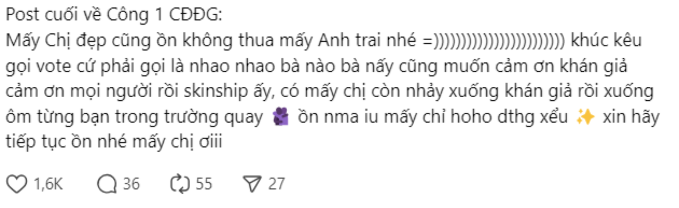 Bên cạnh "thính" từ chính các Chị Đẹp, nhiều khán giả có mặt tại trường quay tham gia ghi hình Công diễn 1 cũng hé lộ những chi tiết khiến cộng đồng mạng không khỏi háo hức. Phần đông các khán giả trường quay đều cho biết, Công diễn 1 của Chị Đẹp rất hoành tráng và đa dạng phong cách, màu sắc âm nhạc.