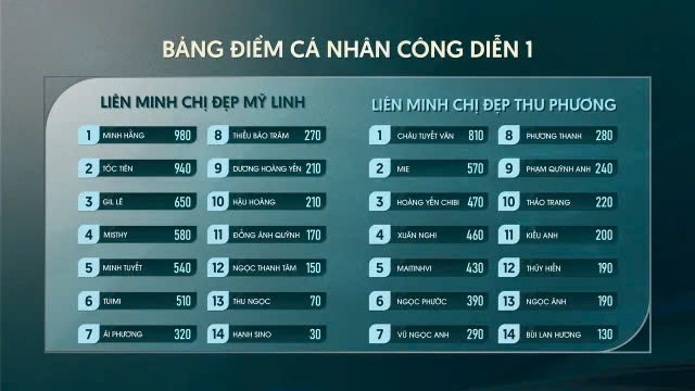 Kết thúc đêm Công diễn 1, Liên minh của Chị Đẹp Mỹ Linh giành chiến thắng với tổng điểm hoa sóng của 14 thành viên đạt 8490 điểm. Trong khi đó, Liên minh của Chị Đẹp Thu Phương chỉ đạt 8290 bình chọn của khán giả. Theo luật của chương trình, Liên minh Thu Phương sẽ phải nói lời tạm biệt 2 thành viên có điểm hoa sóng thấp nhất (Chị Đẹp Ngọc Ánh và Bùi Lan Hương).